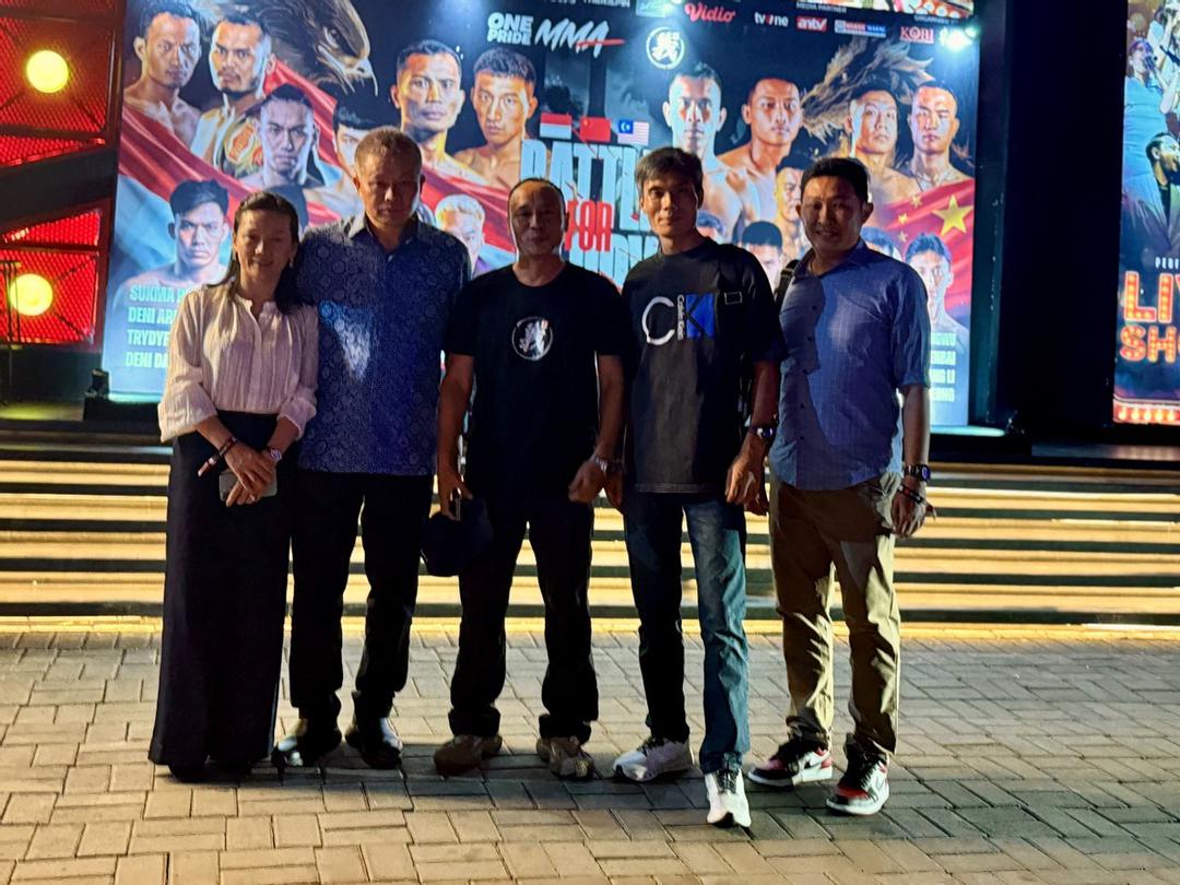 图说:左起:陈日铃、ONE PRIDE MMA老板(左起2)、何志方、郑天弋等组委会高层合影。印尼共工社发
