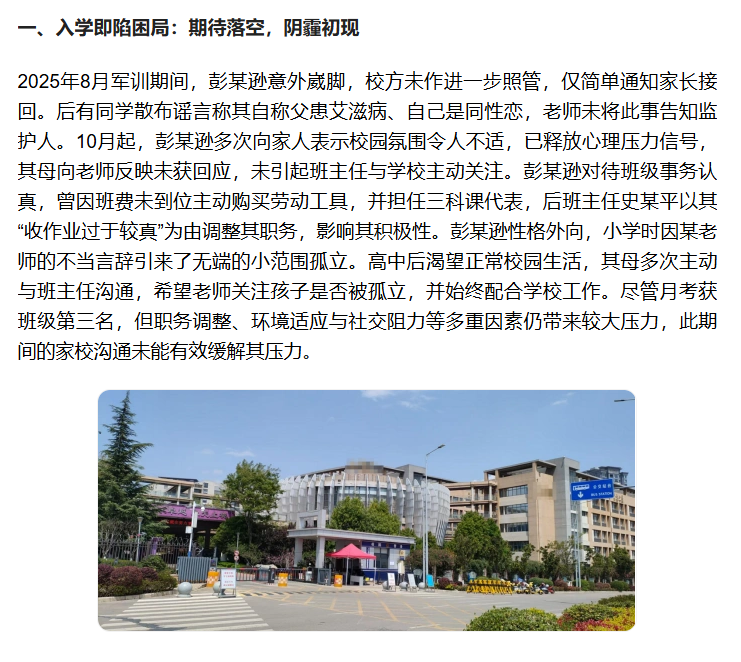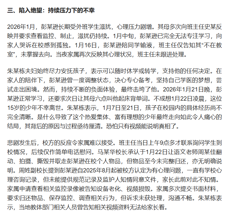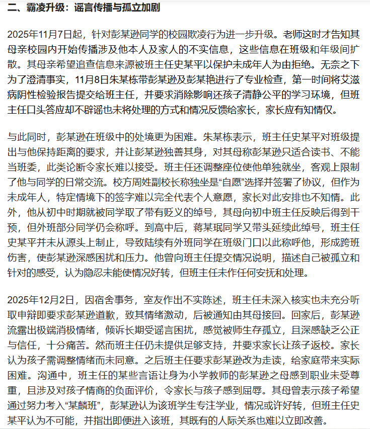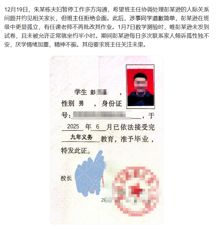 本人转载自百度用户“完满且灵敏丶板栗0V”的文章《被孤立、被造谣、被漠视:15岁少年的校园绝境与父亲的诉求》,如有不实言