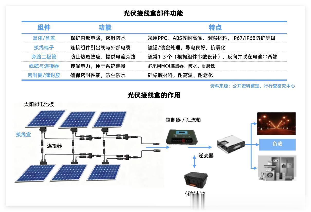 结构主要包括:盒体(密封防尘防水)、盒盖(通常为透明或阻燃材料)、二极管(肖特基或快速恢复二极管)、线缆(耐紫外线、耐低温)及连接器(MC4等标准接口)。