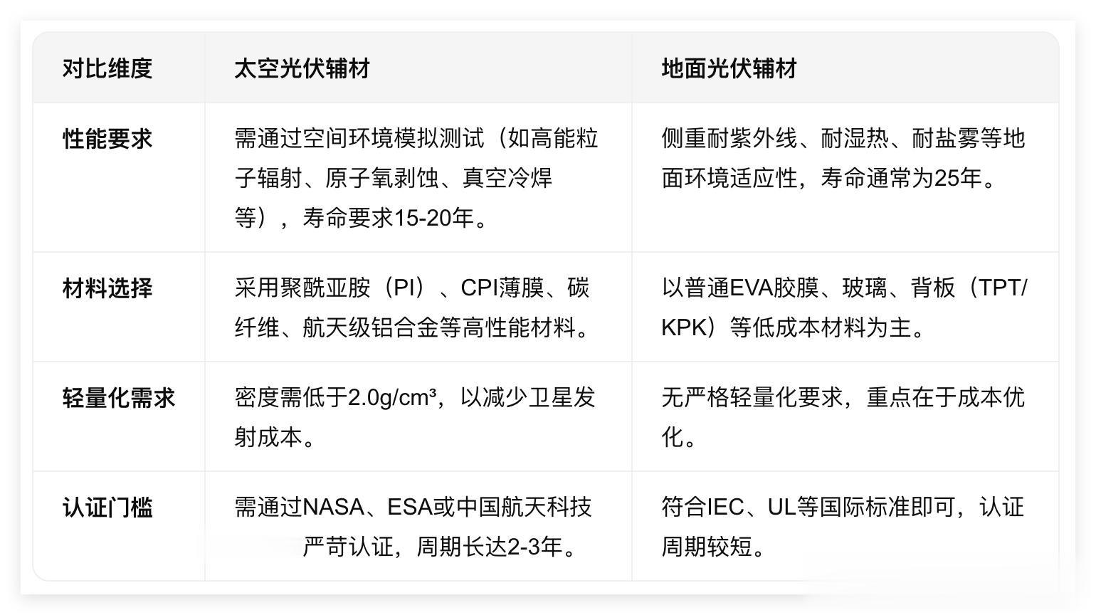 太空光伏辅材和地面光伏辅材的对比: