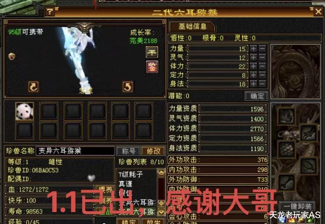 各位老铁,来自【龙争虎斗】服务器的捷报——7级峨嵋大佬逍遥君子,在狂怼16对新宝宝六耳猕猴之后,终于喜提了一只2849裸资质的谨慎红色六耳猕猴。