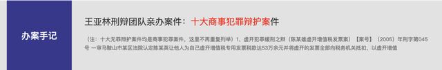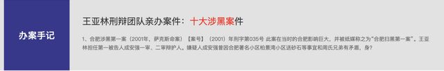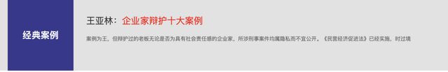 律所的官网中王亚林办理的“十大无罪案”[5]“十大故意杀人案”[6]“十大涉黑案件”[7]“十大职务犯罪案件”“十大贩毒枪下留人案”“十大商事犯罪辩护案件”“十大企业家犯罪案件”等重大、敏感、复杂案件,无不彰显了王亚林深厚的法律底蕴和追求司法公正的胆识和勇气。