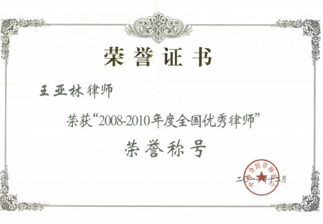 此后,王亚林因社会服务,2006年、2010年两获农工民主党中央“全国社会服务个人突出贡献”奖;2009年蝉联省、市“十佳律师”;2017年因法律帮扶获司法部、中央统战部、全国律协联合表彰;2011年获评司法部、全国律协“全国优秀律师”;2012年获全国律协“律师刑事辩护嘉奖”;2019年获“安徽省优秀中国特色社会主义事业建设者”称号[1]。