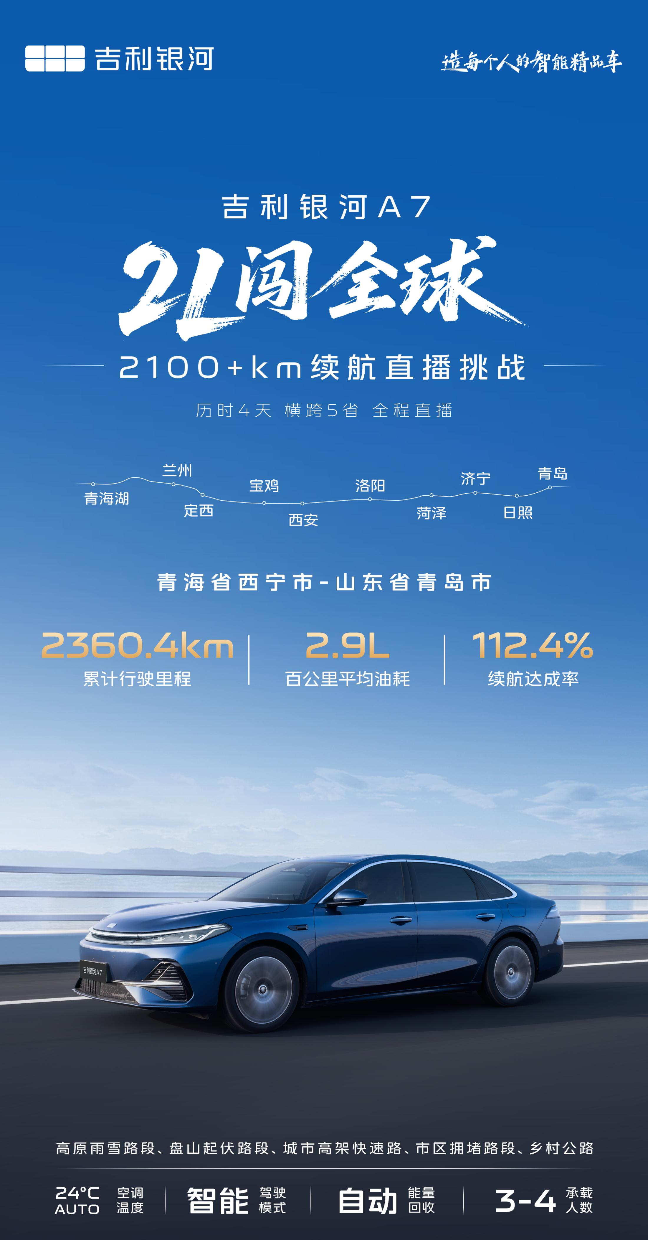若问银河A7的底气从何而来,首先要提的是其“能跑又省油”的硬核实力。10月中旬,一场从青海西宁到山东青岛的长续航直播实测中,银河A7穿越高原雨雪、盘山公路与城市拥堵,4天累计行驶2360.4公里,续航达成率112.4%,百公里油耗仅2.9L。这样的成绩并非偶然——其搭载的雷神AI电混2.0系统功不可没:全球量产热效率最高47.26%的1.5L发动机,配合星睿AI云动力2.0大模型的无图决策功能,能根据导航路况预判能耗,高速巡航时提升发动机直驱效率,拥堵路段优先调用电池,真正实现“怎么开都省、在哪开都省”。此前,它还在日本以2.47L/100km击败丰田普锐斯,在新疆高温环境下达成104.78%续航率,用全球多地实测数据证明了“真续航不怕测”。