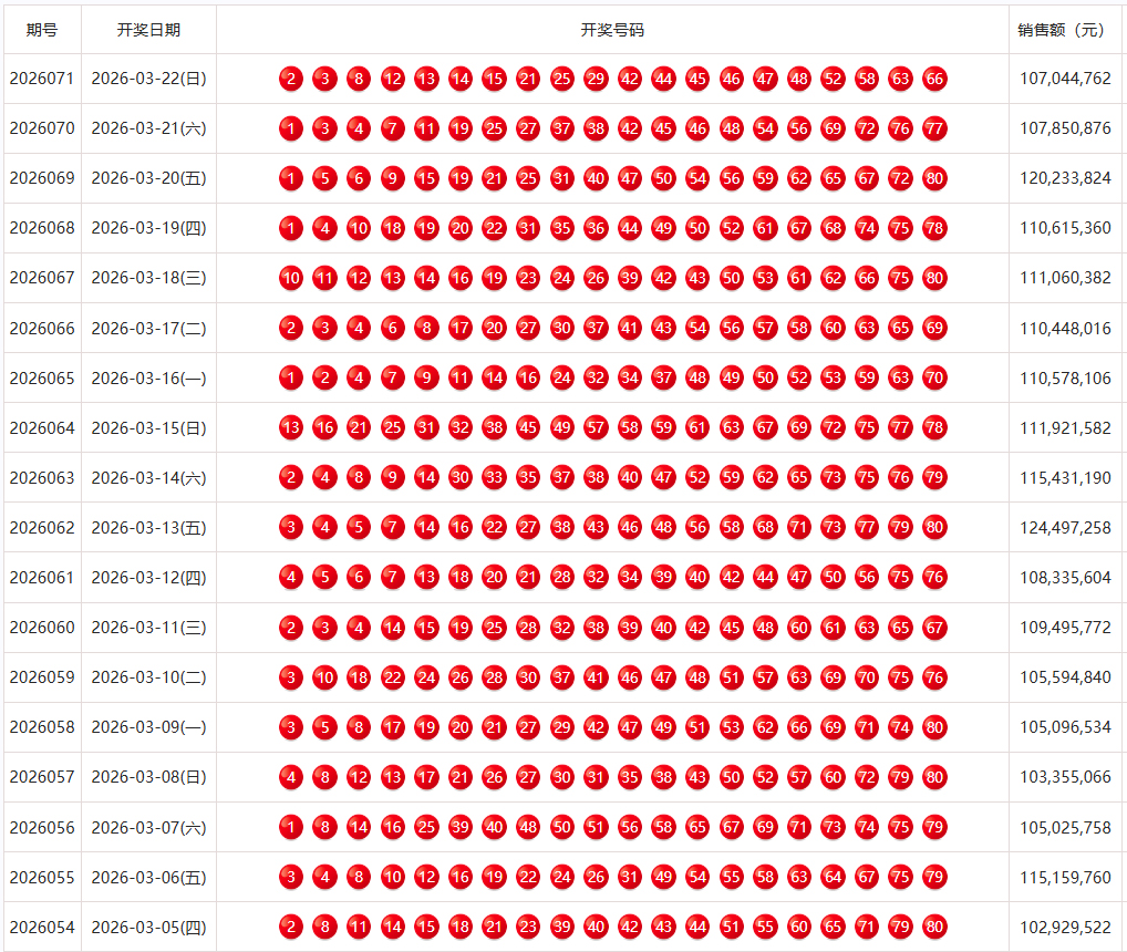 下面是近二十期开奖结果: