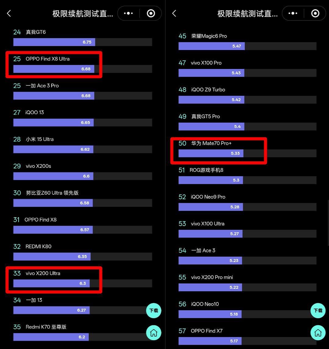 影响用户体验的还有一个关键就是续航,这方面可以单纯看数据。华为Mate70 Pro+的电池容量是5700mAh,在小白评测的续航排行中居50名,配上100W有线+80W无线快充也很有安全感。vivo X200 Ultra则是6000mAh电池排名33,结合90W有线+40W无线充电也够用。最给力的还是OPPO Find X8 Ultra,6100mAh电池在小白评测续航排行榜高居25,还有100W有线+50W无线闪充助力,重度用户完全不用担心。