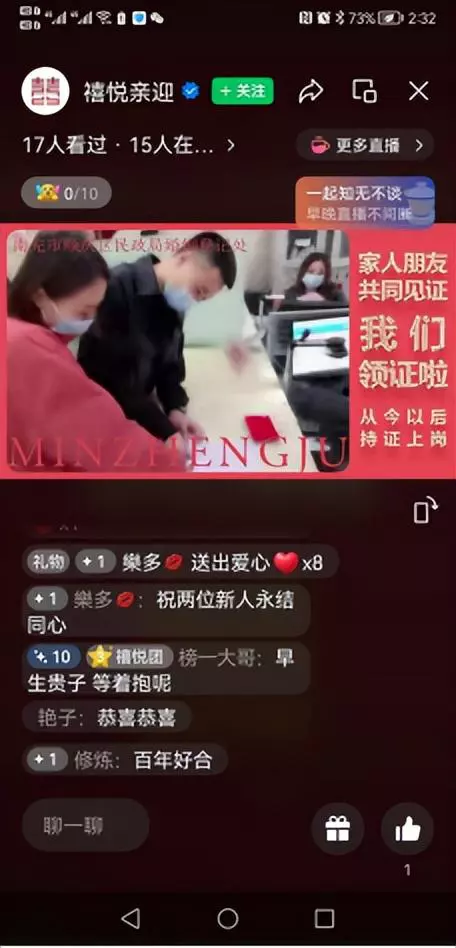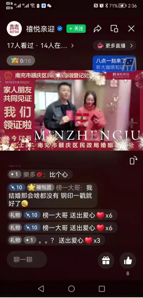 11月以来,南充市顺庆区民政局婚姻登记处创新工作方式,将云直播技术运用到婚姻登记工作中,采用线上、线下同步进行形式。新人在现场登记领证,通过私域直播间双方亲友可在线观看直播,见证新人步入婚姻殿堂,为新人送上来自云端的祝福。