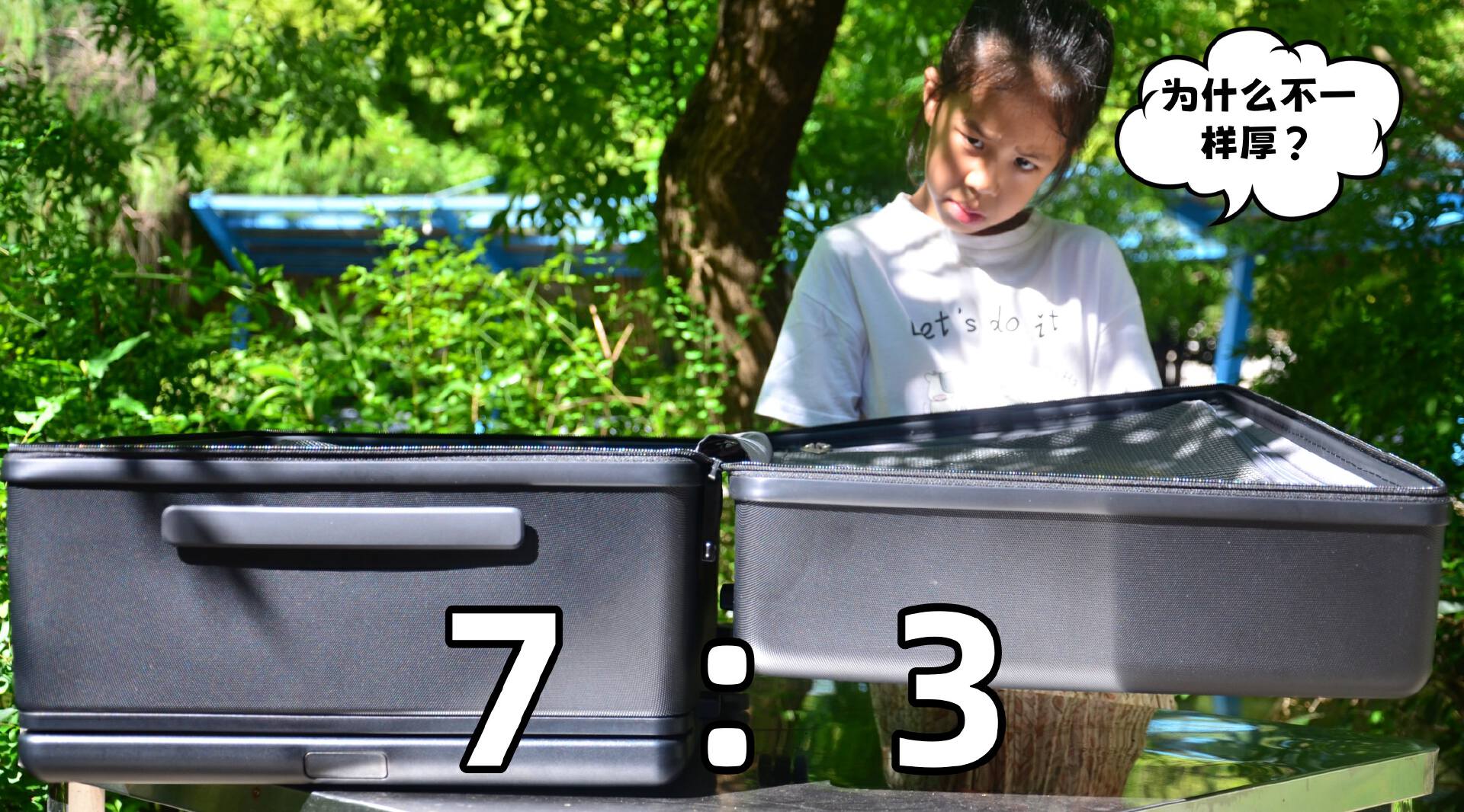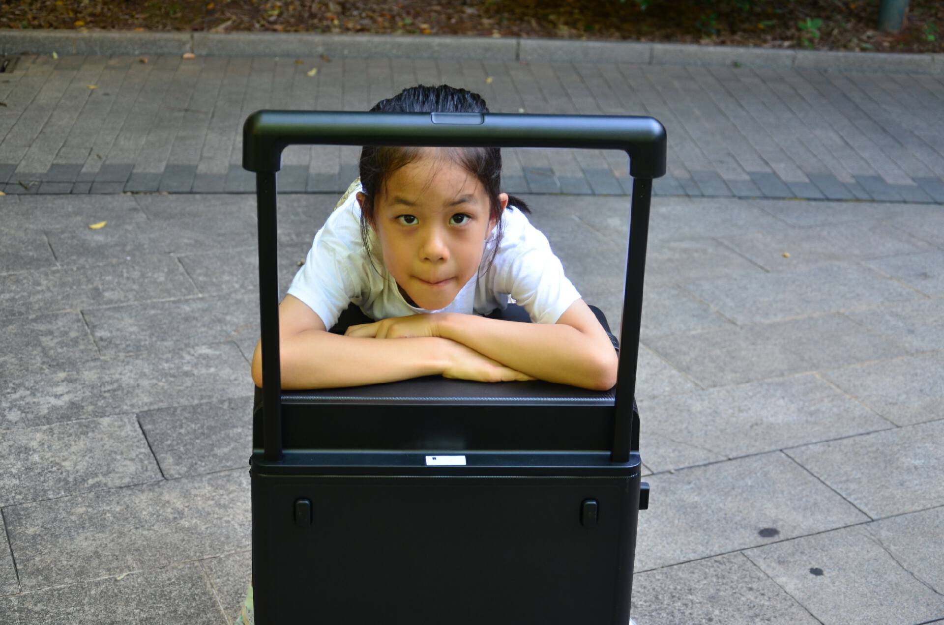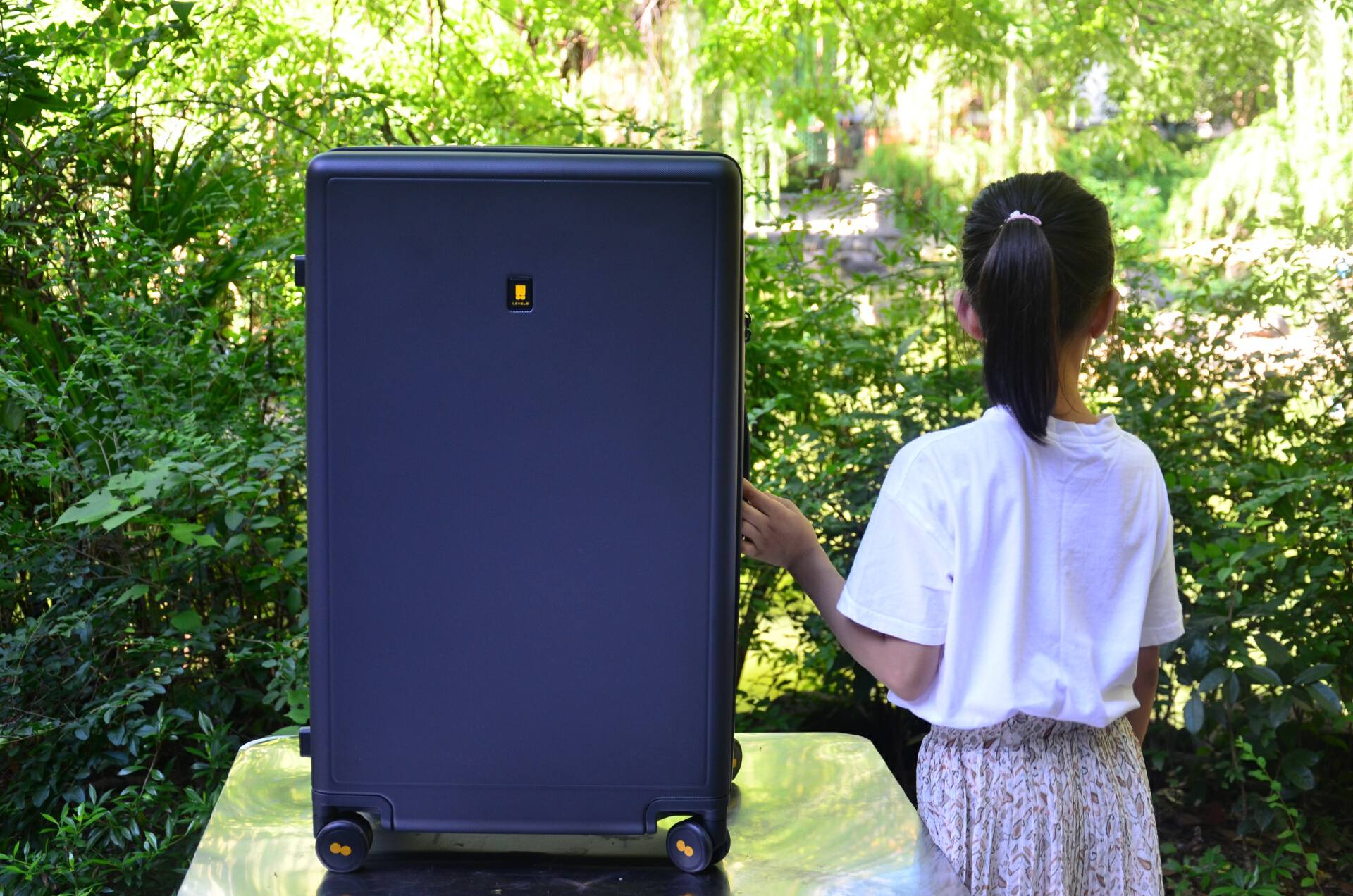 我尝试让女儿坐在空箱上,在内部没有行李抵抗压力的情况下,足以展示科思创PC的优势,箱子外观几乎没有异样。然后女儿站到了箱子上,40多斤的体重,双脚施压,箱体依然无恙。