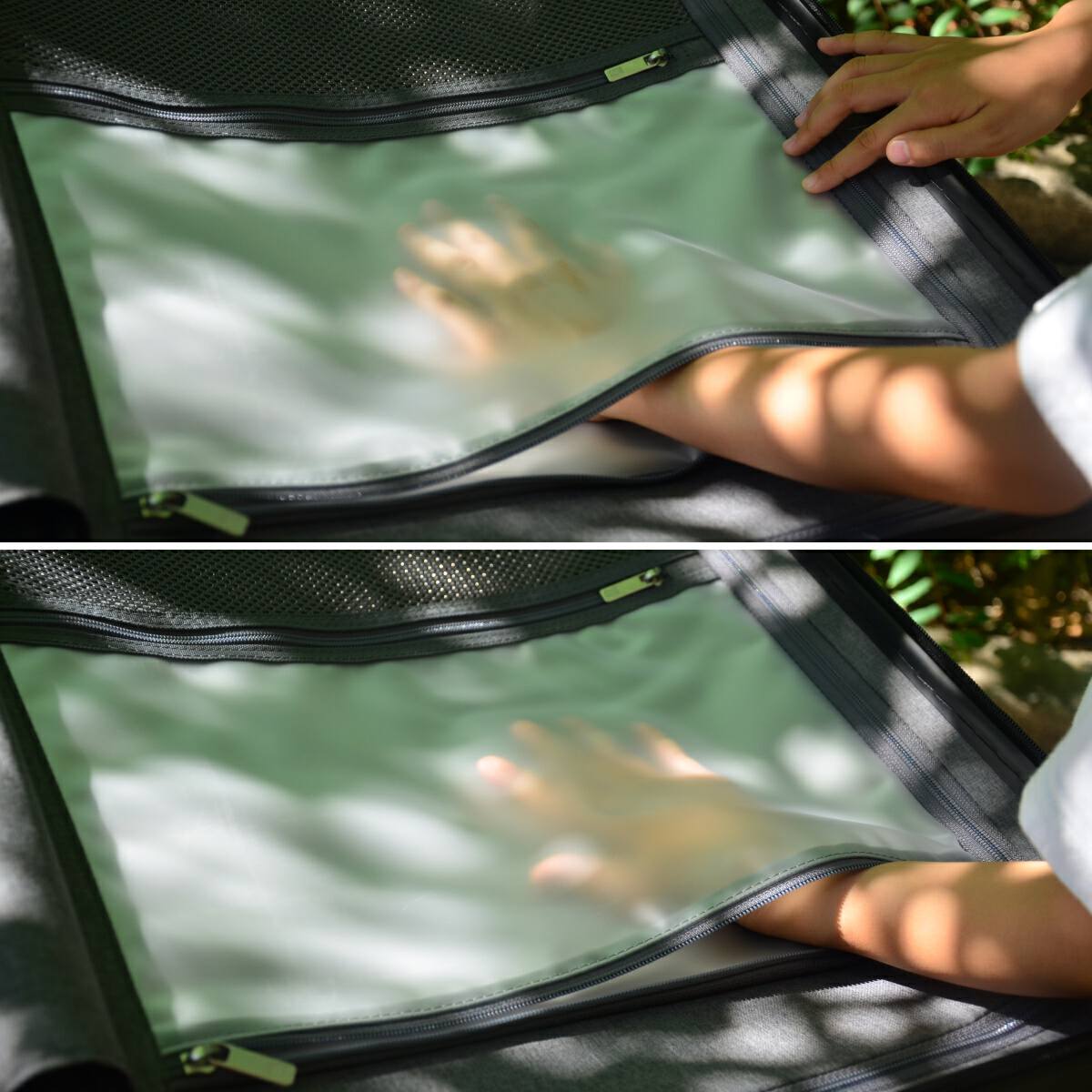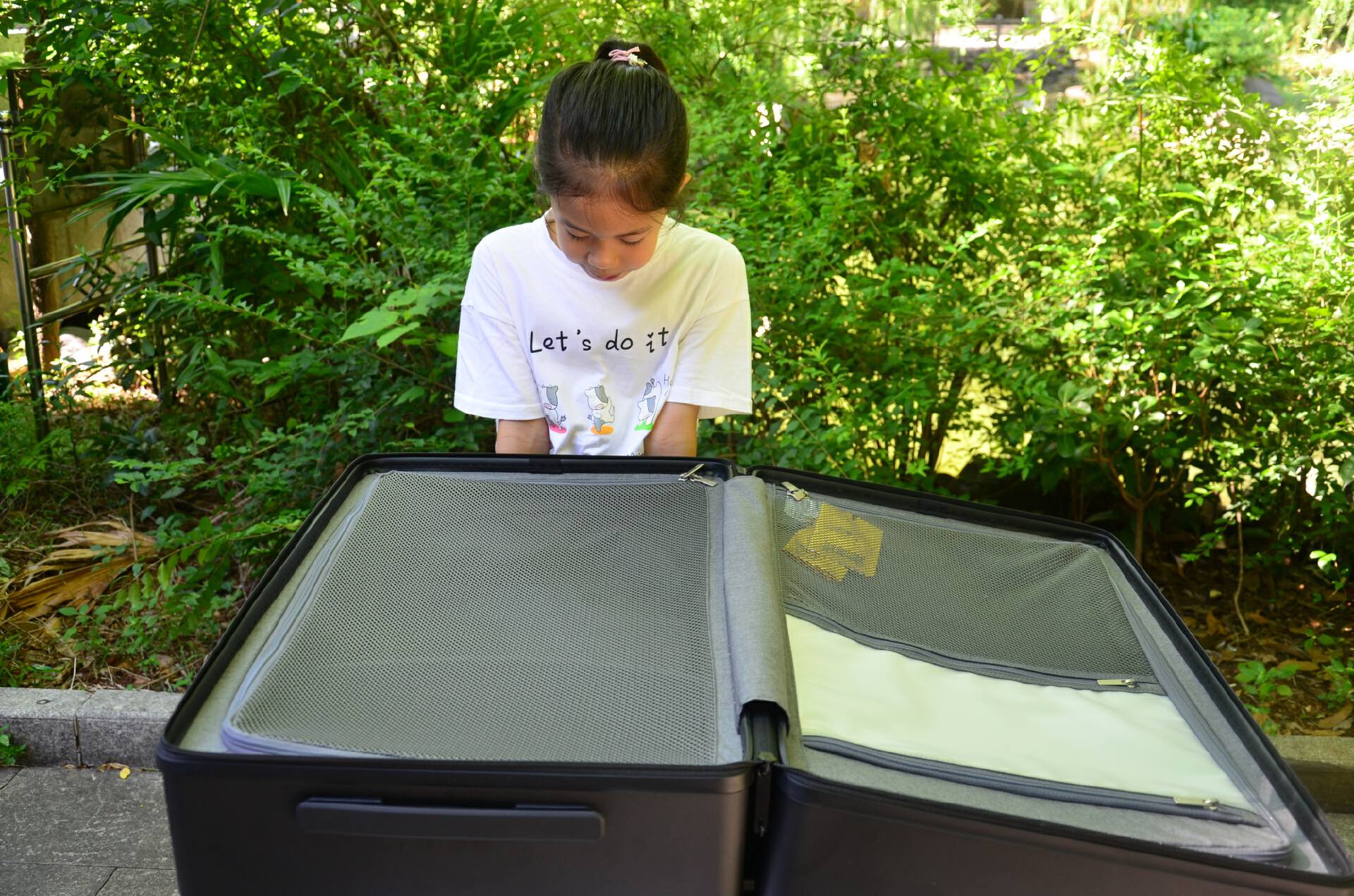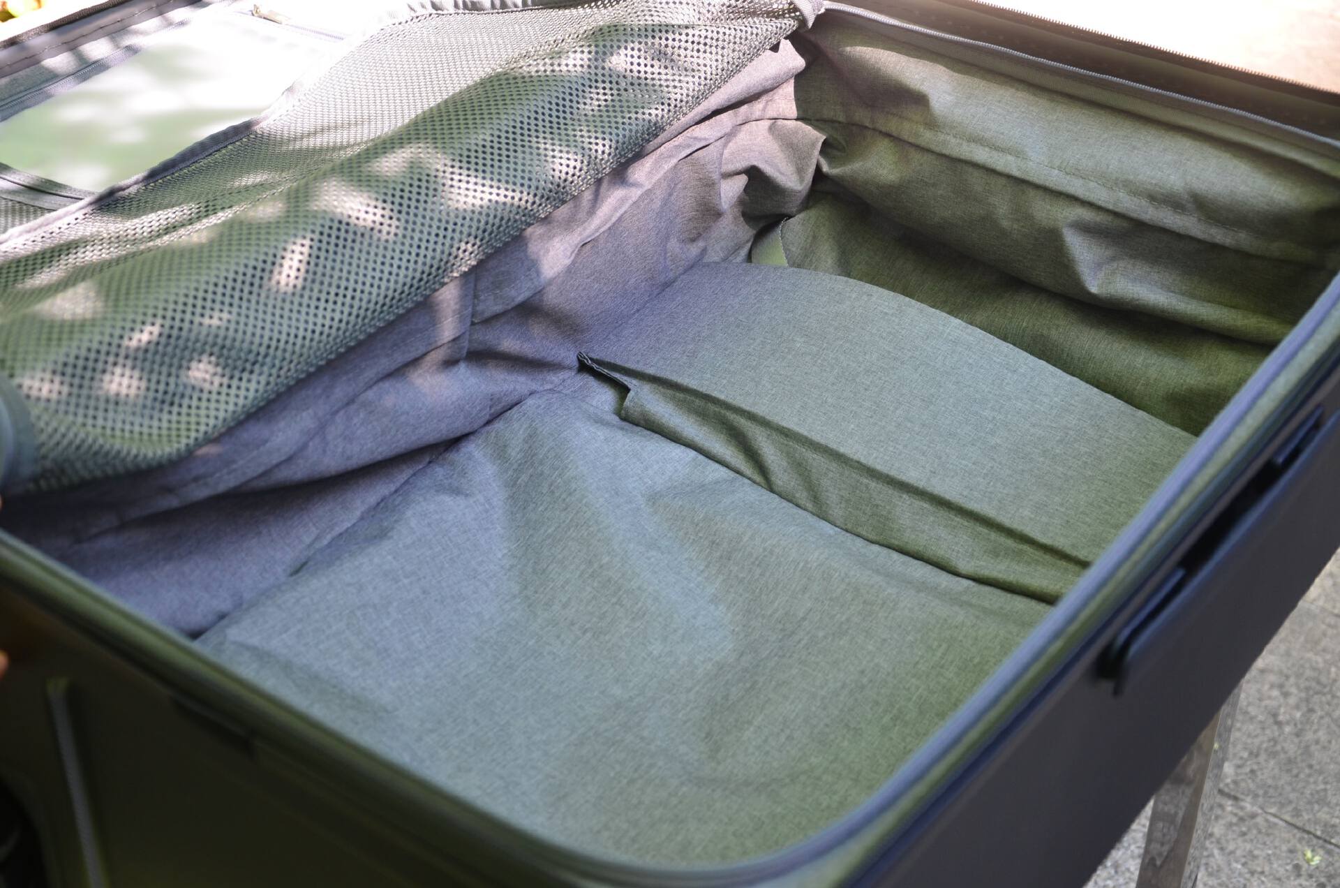 占7成的这边有网布+拉链封闭隔离,打开箱子也有隐私保护,不至于让人一览无遗。