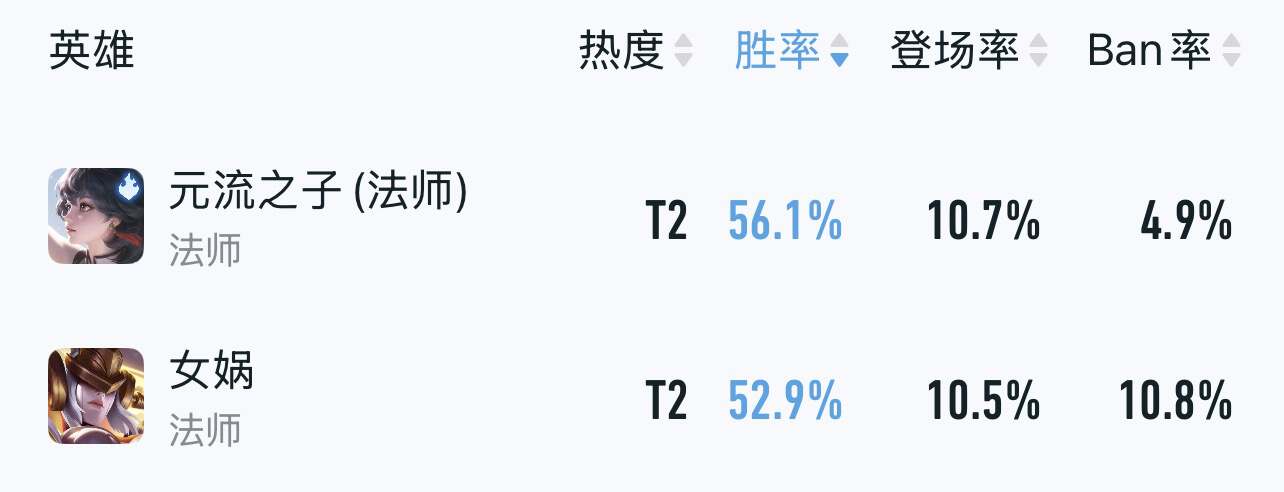 比如说在顶端排位赛里面,元流之子法师的胜率也有 56%,而第二名的法师胜率仅有 52%,这样看的话,相信大家应该就看出来了区别了。