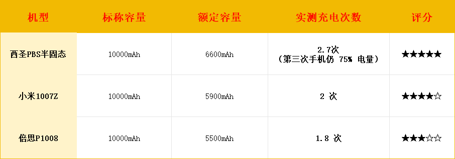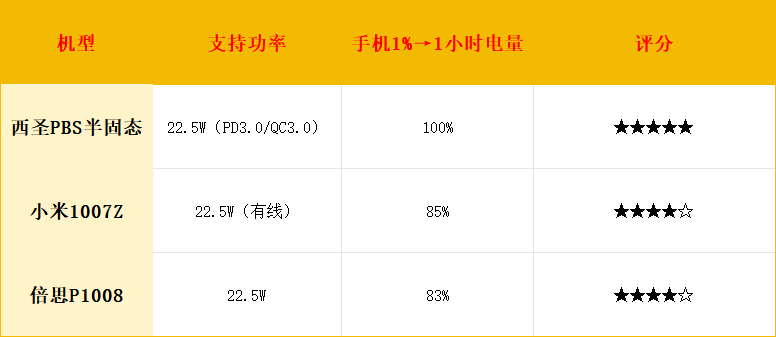 本次实测对比选手有西圣PBS(半固态)、小米1007Z、倍思P1008,我将从充电次数、充电效率、控温散热三个核心维度进行全面对比,所有测评均使用同一型号手机和充电环境,确保数据可比性。