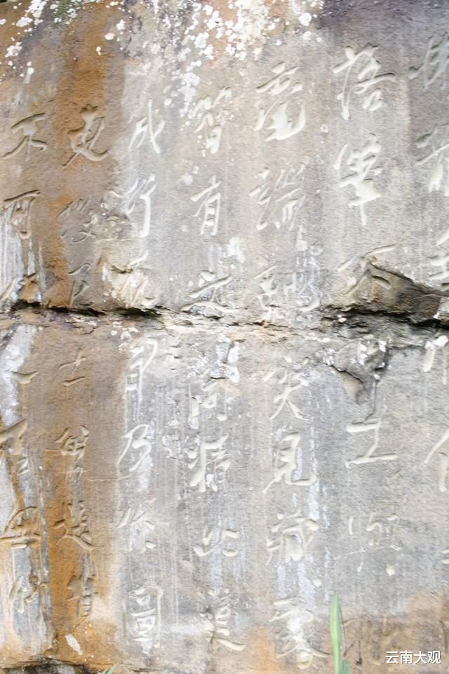 历代的摩崖,作者和作品同框的应该是没有,一方面是照相技术还没有出现,即便当代有,那些摩崖可能过于新了,这种看上去似乎存在了成百上千年的摩崖石刻少见。这幅作品,天地风雨都参加创作了。