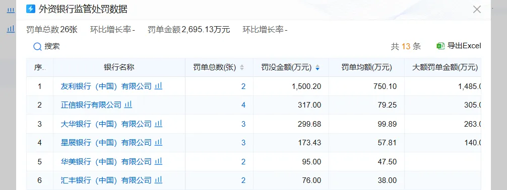 外资银行2025年获得的机构罚单数量为17张,个人罚单数量为9张,罚单总数合计26张,罚没款金额合计2695.13万元。其中,友利银行(中国)以罚没款金额1500.20万元排名第一,独家包揽了整个外资银行业超过55%的罚款金额,罚单总数为2张。正信银行以罚没款金额317.00万元排名第二,罚单总数为4张。大华银行(中国)以罚没款金额299.68万元排名第三,罚单总数为3张。