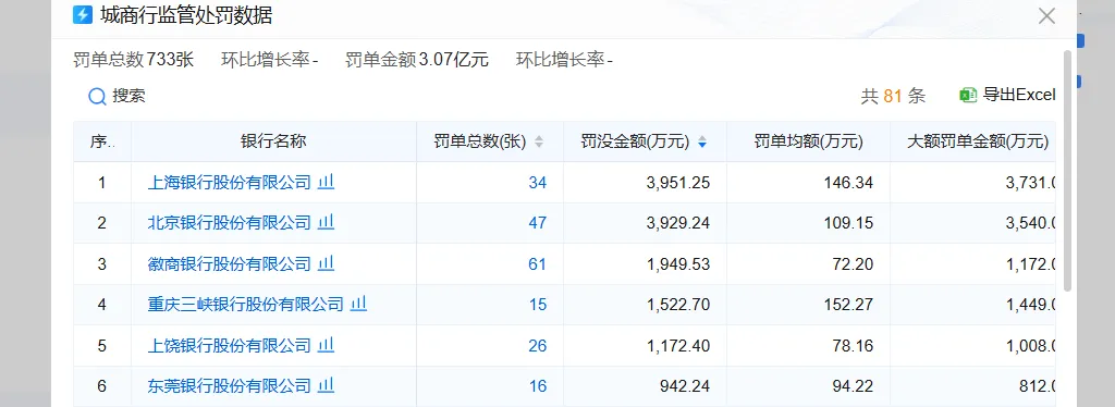 城商银行2025年获得的机构罚单数量为277张,个人罚单数量为456张,罚单总数合计733张,罚没款金额合计3.07亿元。其中,上海银行以罚没款金额3951.25万元排名第一,罚单总数为34张。北京银行以罚没款金额3929.24万元排名第二,罚单总数为47张。徽商银行以罚没款金额1949.53万元排名第三,罚单总数为61张。