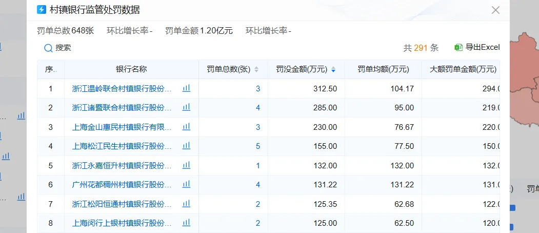 村镇银行2025年获得的机构罚单数量为301张,个人罚单数量为347张,罚单总数合计648张,罚没款金额合计1.20亿元。其中,浙江温岭联合村镇银行以罚没款金额312.50万元排名第一,罚单总数为3张。浙江诸暨联合村镇银行以罚没款金额285.00万元排名第二,罚单总数为4张。上海金山惠民村镇银行以罚没款金额230.00万元排名第三,罚单总数为3张。