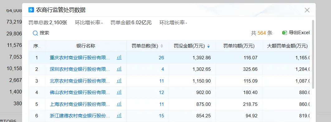 根据银行类型划分,农商银行的罚单总数高居榜首地位。农商银行2025年获得的机构罚单数量为741张,个人罚单数量为1419张,罚单总数合计2160张,罚没款金额合计6.02亿元。其中,重庆农商银行以罚没款金额1392.86万元排名第一,罚单总数为26张。深圳农商银行以罚没款金额1302.65万元紧随其后,罚单总数为4张。第三名北京农商银行罚没款金额1150.90万元,罚单总数为11张。