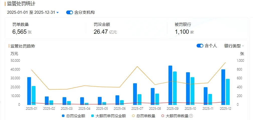 日前,据企业预警通提供的信息显示,在刚刚过去的2025年里,银行业累计被全国各地的金融监管机构开出6565张罚单(以罚单披露日期为准),罚没款金额合计高达26.47亿元,共计1100家银行(含分支机构)被罚。