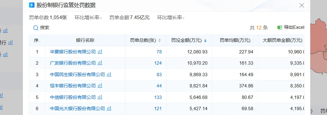 股份制银行的罚没款金额高居榜首地位。股份制银行2025年获得的机构罚单数量为398张,个人罚单数量为656张,罚单总数合计1054张,罚没款金额合计7.45亿元。其中,华夏银行以罚没款金额1.21亿元排名第一,罚单总数为78张。广发银行以罚没款金额1.10亿元排名第二,罚单总数为124张。