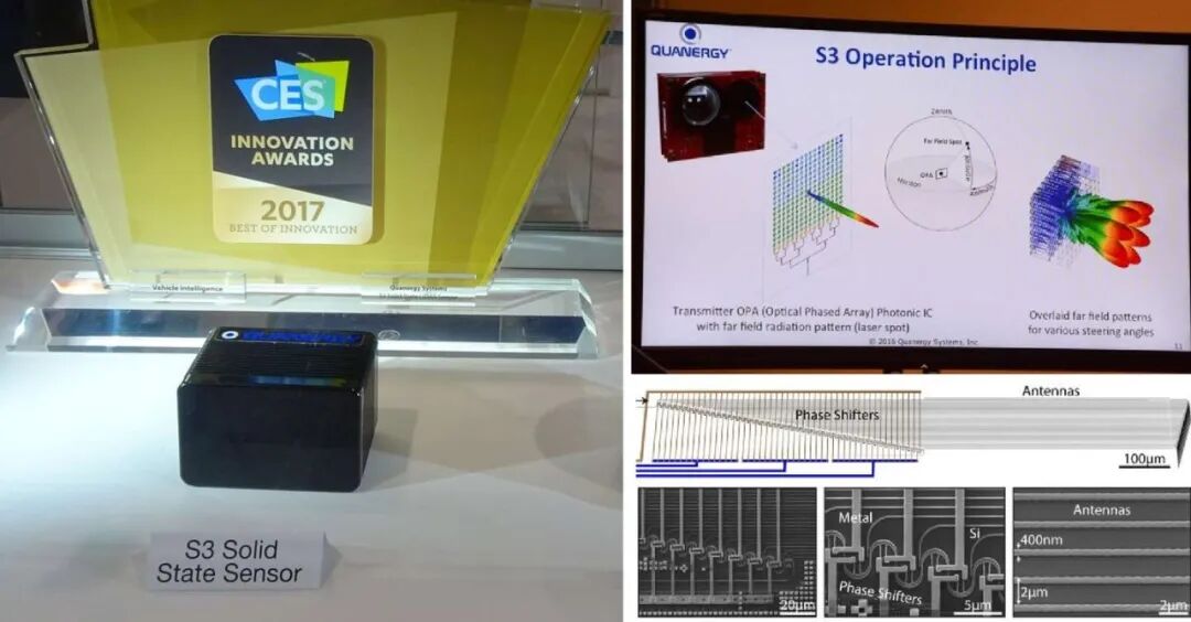 美国初创公司Quanergy的“固态”激光扫描仪S3首次引入了全固态激光激光的概念。简单的说这是一款全“固态”的激光雷达,或者称光学相控阵激光扫描雷达。其满足了激光扫描仪小型化的大趋势,整个尺寸只有90mm x 60mm x 60mm。产品工作原理展示中可以看到内部机构不存在任何的机械旋转部件。所有的激光探测水平和垂直视角都是通过电子方式实现的。因此其名副其实的是全“固态”激光扫描仪产品。由于其创新的全固态概念获得了CES2017创新奖。Quanergy 曾在 2021 年通过SPAC特殊目的收购上市,但不久因为技术无法落地宣告破产。