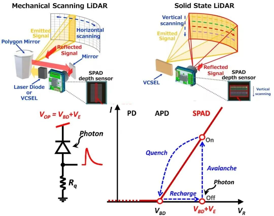 回过头来看享界S9T的华为高精度固态激光雷达怎么就做成了呢?怎么跨过这些难关的呢?难不成东大真的在月之背面发现的黑科技?其实说到底华为还是死磕了前面提到的其他类别中的VCSEL方向,并关键攻关突破了SPAD单光子雪崩二极管。在激光雷达探测器技术路线中,APD 雪崩光电二极管依靠倍增效应提升弱信号的检测能力,而 SPAD 则通过在击穿区工作实现单光子探测。SPAD 的关键在于引入淬灭quenching工艺。每当单光子触发雪崩后电路迅速将其关断并复位使探测过程线性可控。从而实现高灵敏度与可重复的光子计数,这也是其相较于 APD 的核心优势和走向量产的重中之重。