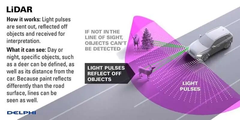 车用激光雷达工作原理就是蝙蝠测距用的回波时间(Time of Flight,缩写为TOF)测量方法。但要知道光速是每秒30万公里。要区分目标厘米级别的精确距离,那对传输时间测量分辨率必须做到1纳秒。要如此精确的测量时间,因此对应的测量系统的成本就很难降到很低,需要使用巧妙的方法降低测量难度。通过旋转的机械镜面测量激光发出和收到回波的时间差,从而确定目标的方位和距离。由于激光雷达主动发射激光,因此受环境光变化的影响小,测距精确。