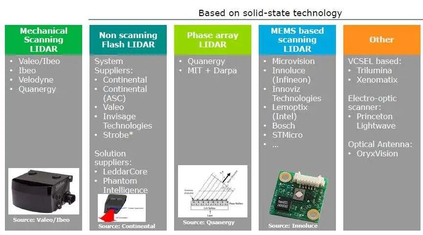 激光雷达LiDAR关键部件按照信号处理的信号链包括控制硬件DSP数字信号处理器、激光驱动、激光发射发光二极管、发射光学镜头、接收光学镜头、APD雪崩光学二极管、TIA可变跨导放大器和探测器。其中除了发射和接收光学镜头外,都是电子部件。随着半导体技术的快速演进,性能逐步提升的同时成本迅速降低。但是光学组件和旋转机械则占具了激光雷达的大部分成本。按照8年前2017年CES消费电子展发布的激光雷达定义。5个分类中有4个属于固态激光技术。