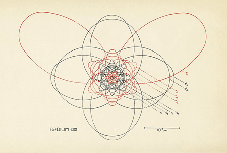 丹麦物理学家尼尔斯·玻尔试图用一组围绕中心原子核运行的轨道来解释电子在原子结构中的角色,如这幅描绘镭元素的老式插图所示。随着量子力学在一个世纪前的提出,这种精确轨道的模型被电子的能级概念所取代,电子不再具有明确路径。