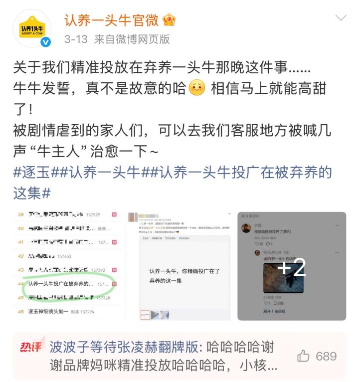 更绝的是,认养一头牛的投放精准卡在男女主分别的剧情,被网友戏称为“弃养一头牛”,并顺势玩起“认养→弃养→再认养”的接龙梗。品牌非但没生气,反而大方互动,让粉丝去官旗找客服被喊几声“牛主人”治愈一下,既接住了网友的梗,又把剧粉丝滑地导流到品牌私域。让品牌瞬间脱离了冷冰冰的商业背景,成了一个能开得起玩笑、懂剧粉心碎的“活人”伙伴。