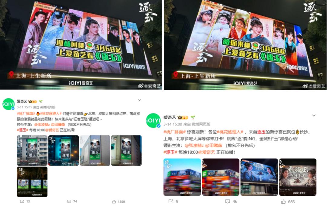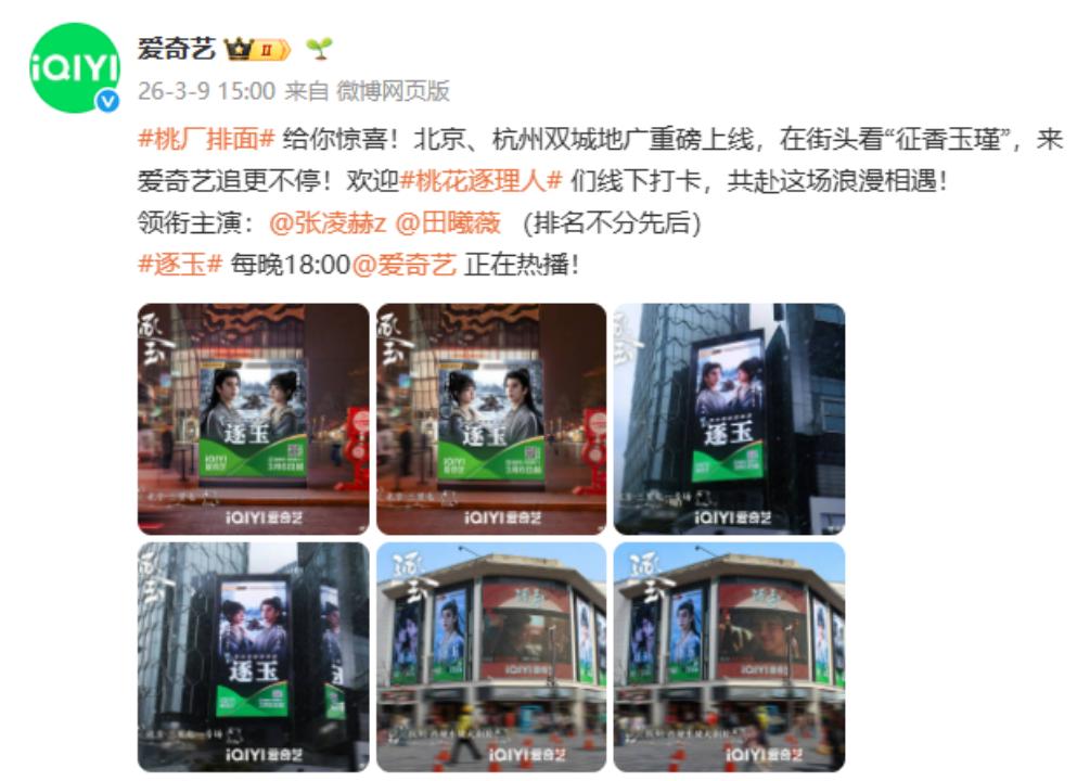 线下“桃厂排面”也同步拉满,剧集热播期间,爱奇艺在北京、上海、杭州、长沙、成都等多城铺开《逐玉》地广,为观众打造了一场浪漫的“全城偶遇”。不少热情粉丝专程奔赴线下打卡晒图,自发形成二次传播,让剧集的热度与氛围,完成了从线上到线下的完整闭环。
