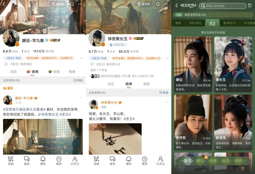 首先,是角色的“人格化”延伸——谢征和樊长玉的角色微博账号成为了故事的“戏外戏”,粉丝可以通过这些账号与角色共呼吸;爱奇艺的“桃豆世界”中谢征和樊长玉的AI角色,则承接了粉丝的碎片化热情,通过对话、同人内容创作和虚拟社交,成为了粉丝日常的情感出口。