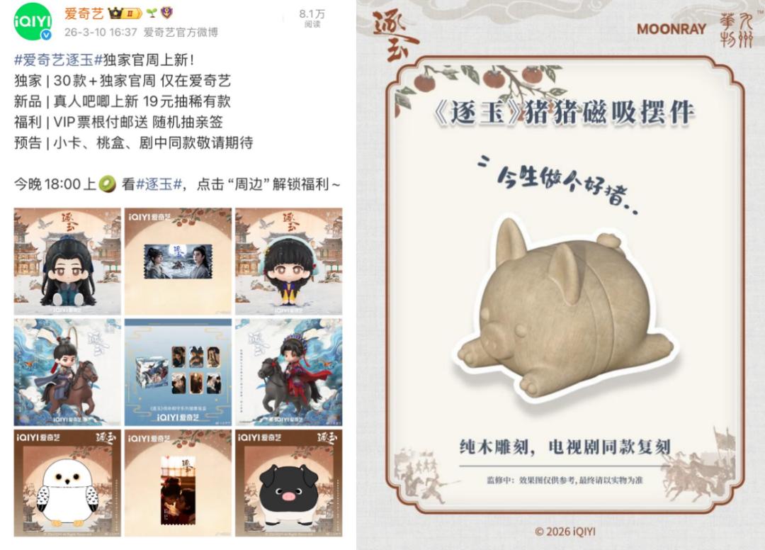 随着剧集持续热播,爱奇艺也在不断上新周边新品。最新推出的《逐玉》磁吸猪猪摆件,也凭借高还原度的萌趣设计,再次掀起粉丝的收藏热潮。丰富的IP周边成为连接剧集与观众的情感纽带,让剧迷在观剧之外,也能将剧中的温暖与趣味带入日常,进一步强化了IP的传播力与粉丝黏性。