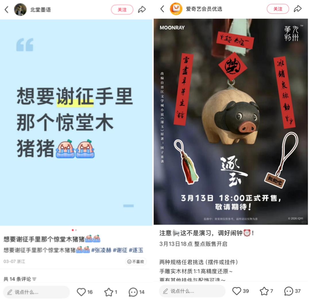 此外,这种对剧迷的回应也延伸到IP周边玩法上。《逐玉》中的猪猪惊堂木因呆萌的外形备受粉丝喜爱和求同款。爱奇艺“有求必应”,不仅火速上线了1:1的手雕猪猪惊堂木摆件,还推出手机春联贴纸等周边作为福利赠送。