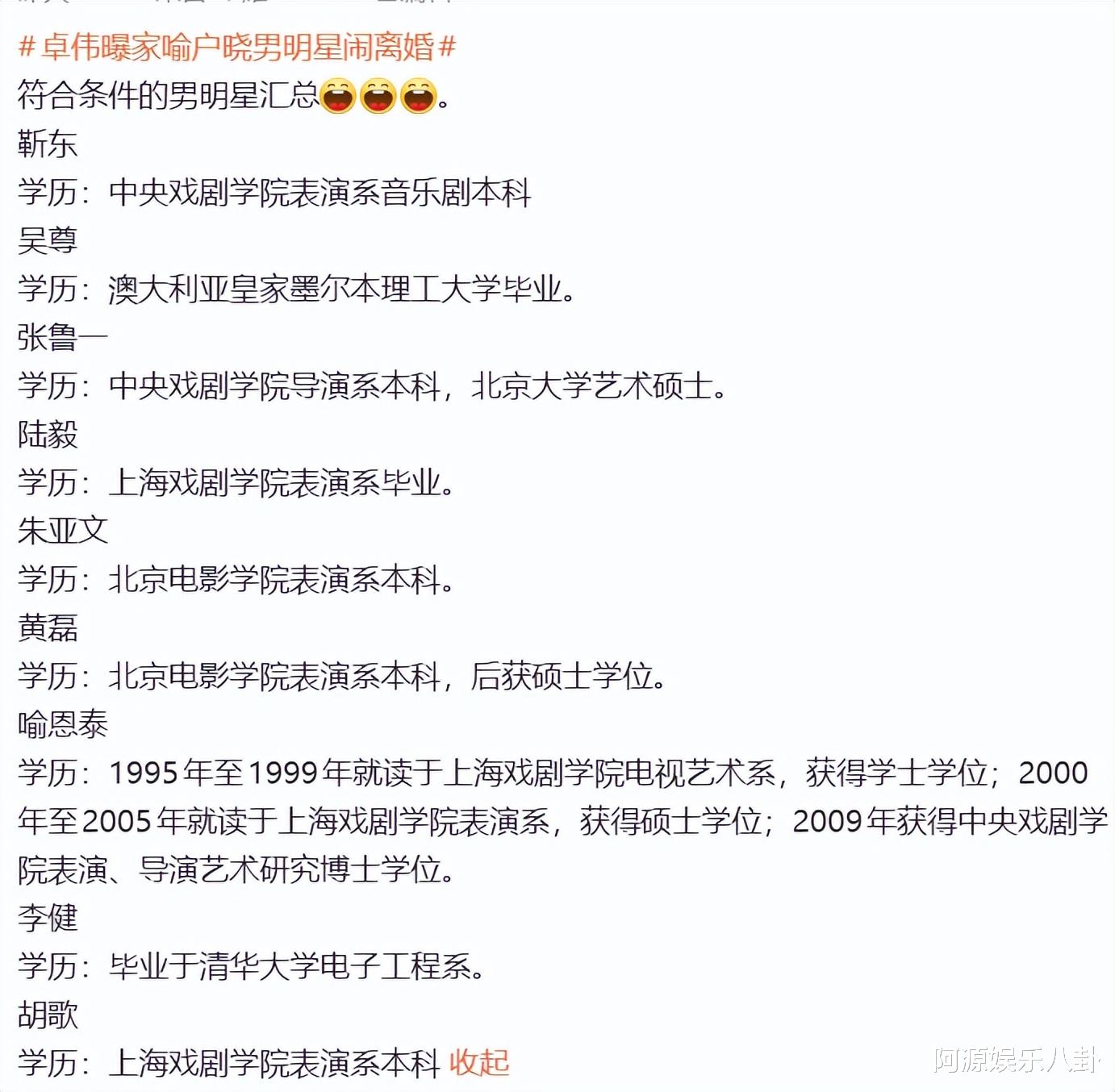 但无聊吃瓜的网友们居然也根据这些关键词,顺势罗列了几位符合高学历且已婚且算国民度还不错的男明星出来: