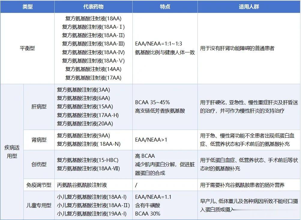 目前,临床应用的氨基酸制剂根据其作用和用途分为营养型和治疗型。营养型复方氨基酸一般指平衡型氨基酸,多由18种不同氨基酸组成;而治疗型复方氨基酸根据其组方和用途不同,又分为肝病用氨基酸、肾病用氨基酸、创伤用氨基酸和小儿用氨基酸等制剂品类(如表1)。