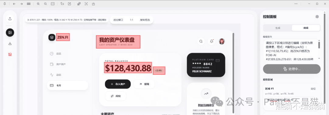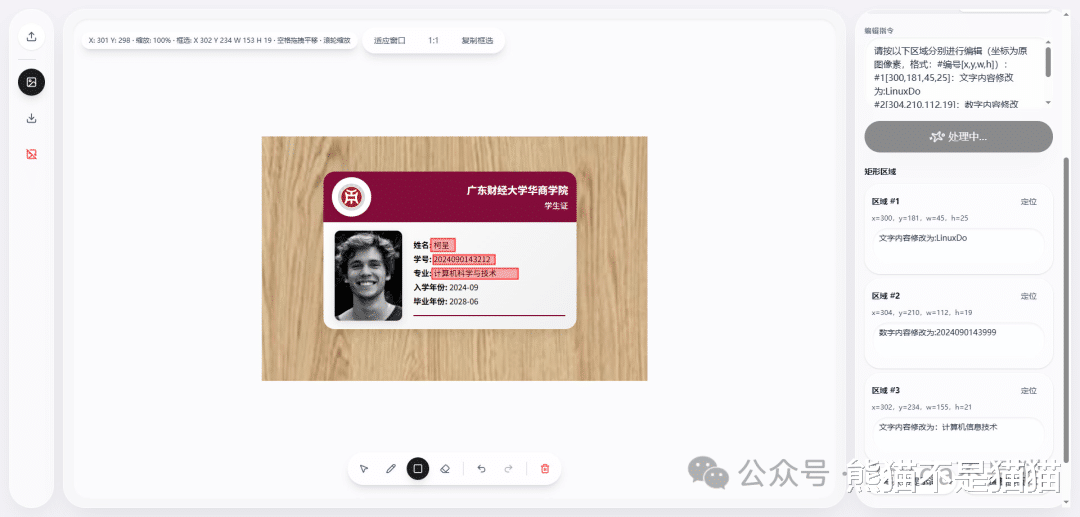 当我们需要改变一张图中的元素时,将其图片上传,随后通过画笔工具将需要修改的位置进行涂抹,最后在右边会得到编辑指令,AI会根据指令识别其中的区域,这时候就可以根据你的需求改变其中的一些元素,例如文字信息。