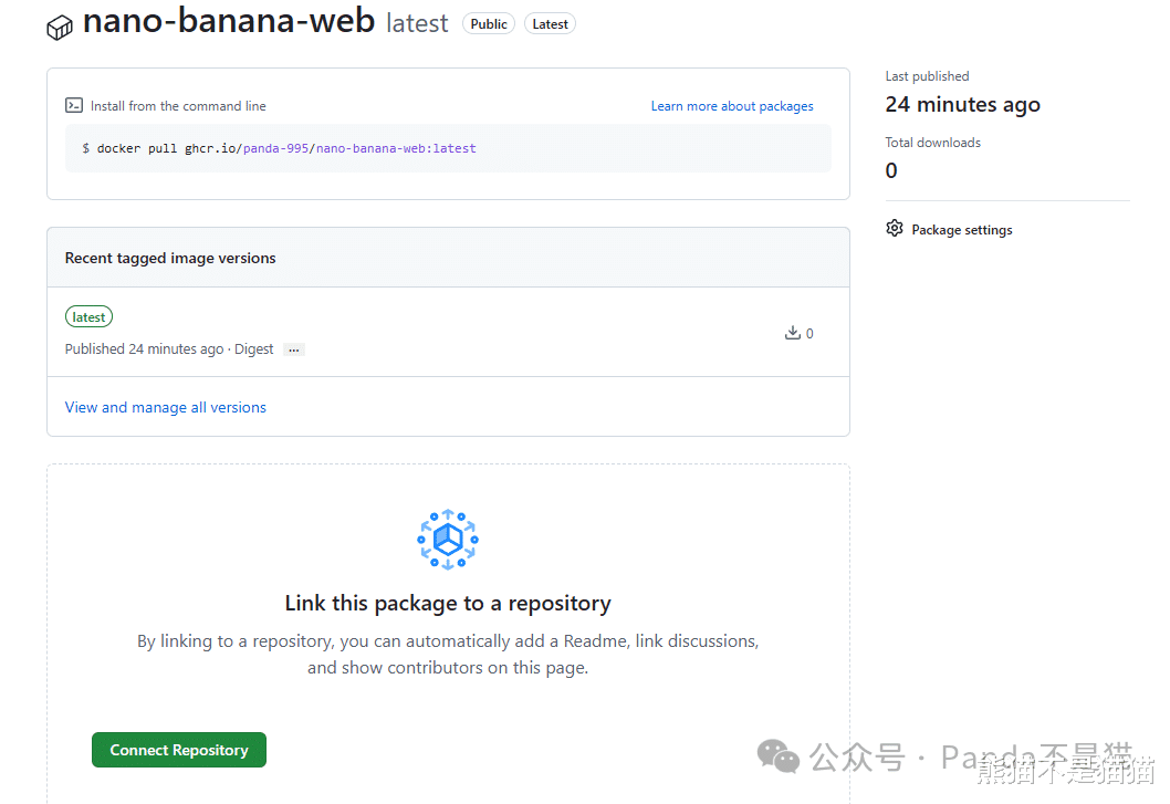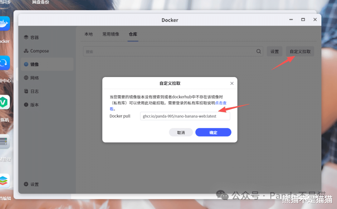 熊猫构建的镜像地址为:ghcr.io/panda-995/nano-banana-web:latest,针对这种非DockerHUB上的镜像,在进行镜像拉取一定记得带上站点的名称,随后通过极空间Docker仓库的自定义拉取去进行操作。