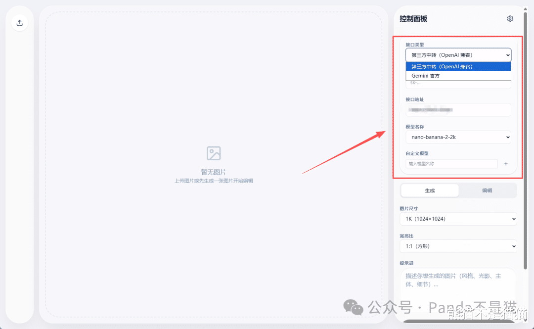 除了gemini官方,也支持OpenAI接口的第三方模型,支持接口地址自定义。除此之外就是下方的图片尺寸与宽高比设置,最大支持4K的输出,不过测试4K下不支持流式传输,同时2K的输出时间要快一些,精度要求不高个人建议2K其实就够用了。