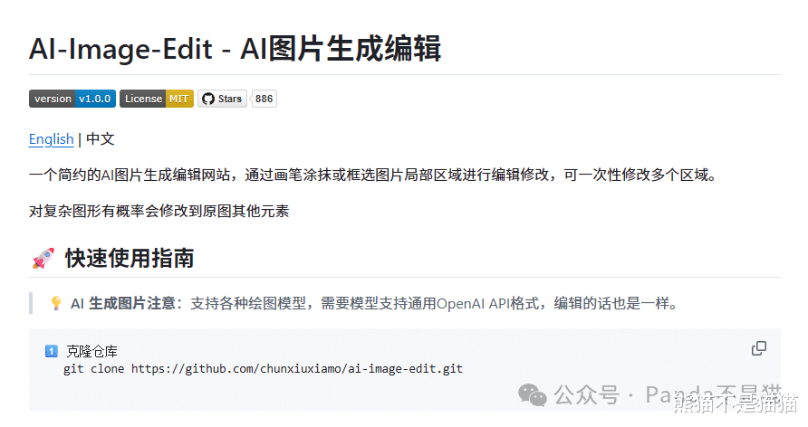AI-Image-Edit并没有提供已经打包好的镜像供我们使用,不过作者提供了Dockerfile文件,所以你可以直接将项目下载下来之后自行构建,或者直接用熊猫构建好的容器镜像。