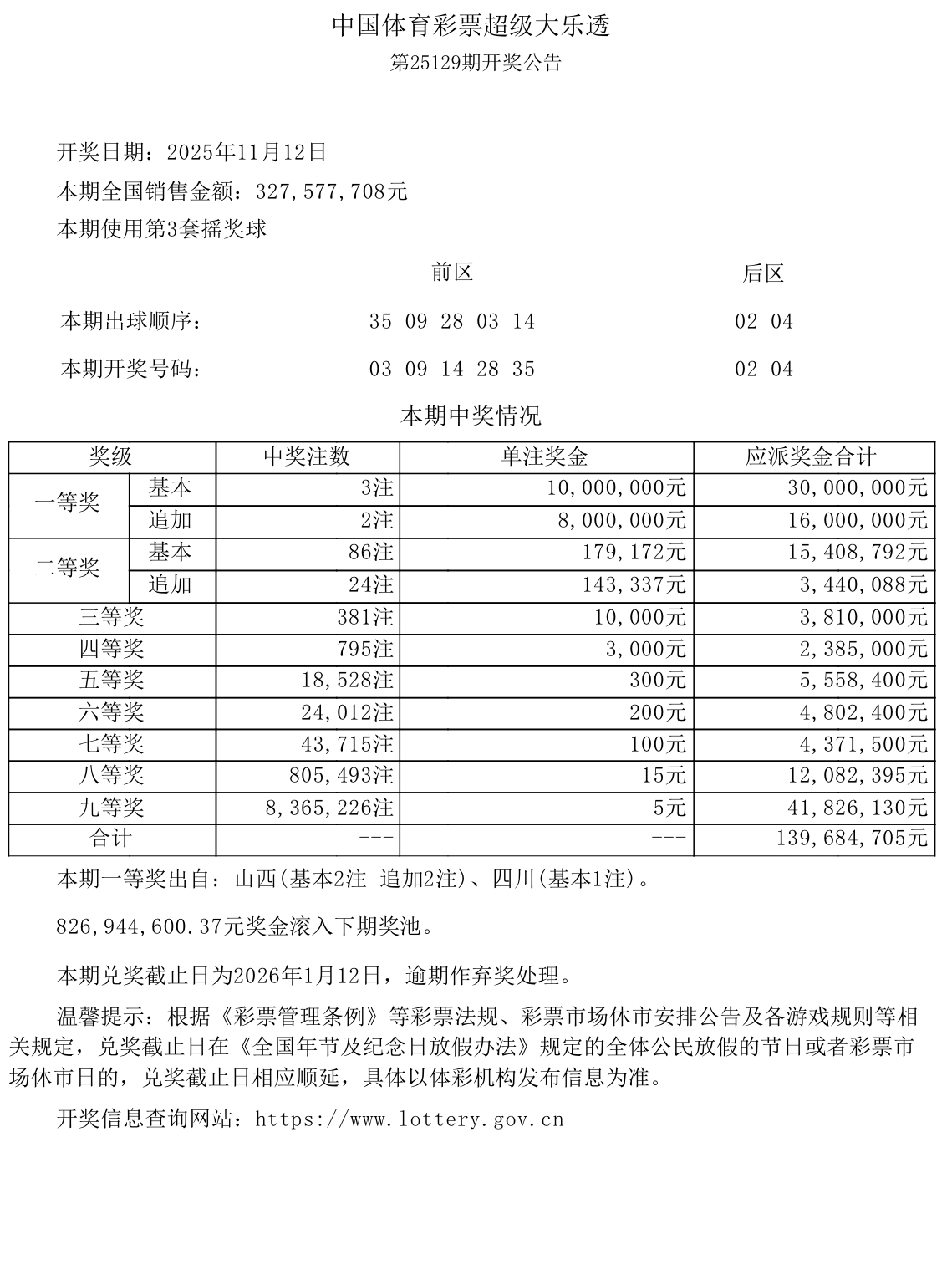 体彩超级大乐透②⓪②⑤129期开奖结果