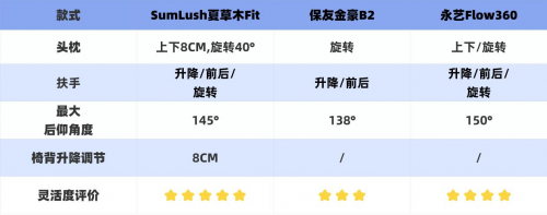 夏草木这款的可调节灵活度是最高的,最大后仰角度可以去到145°,午休的时候就像躺在床上一样,头枕的话可以进行上下、旋转调节,扶手可以进行上下、前后、左右调节,而且椅背还能进行三档调节,调整到用户自己喜欢的位置。