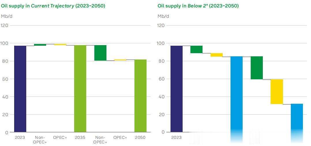 在“低于2℃”转型情景中,石油需求萎缩更早、更快,非OPEC+和OPEC+产量都将出现大幅度下滑。但是,OPEC+市场份额会持续上升,预计到2035年增至55%,2050年突破60%。