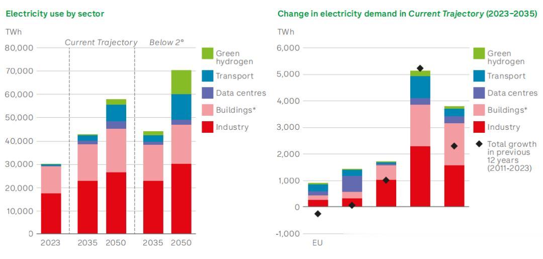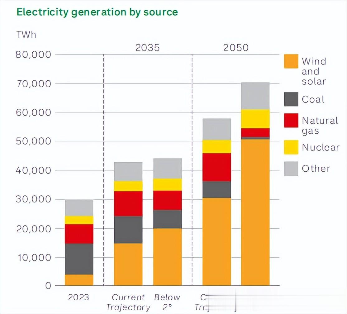 在“当前轨迹”下,预计到2035年,全球电力需求将超过4万太瓦时,比当前水平高出40%以上;到2050年,总需求预计将达到2023年的近两倍。