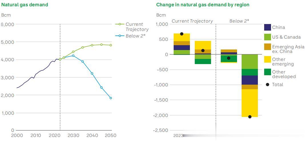 而在“低于2℃”转型情景中,随着全球电气化与去碳化进程加速,天然气需求将在2030年后迅速下滑。到2050年,其份额占比将降至15%,虽略高于石油,却远远低于可再生能源56%的份额。