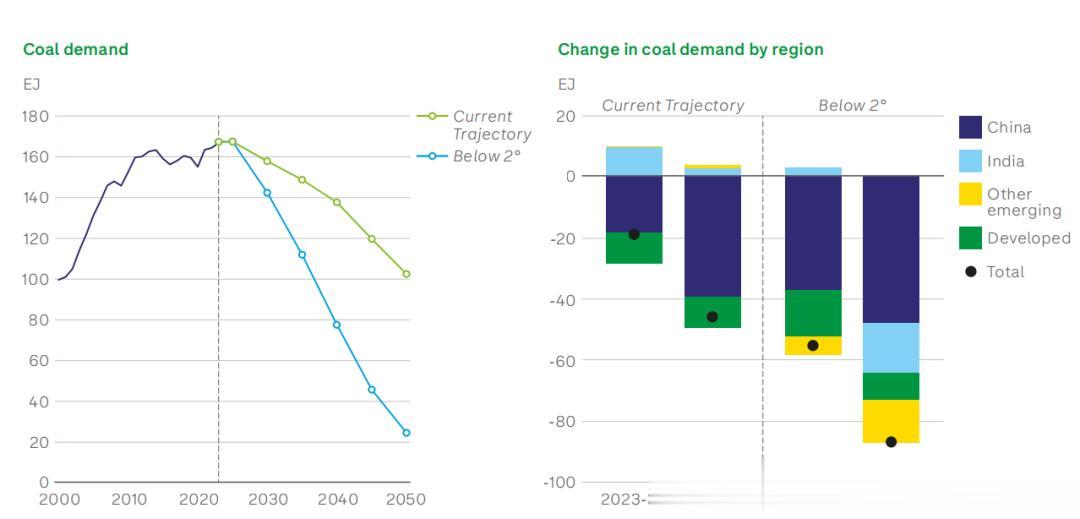 2035年后,煤炭消费量将快速下降。按“当前轨迹”,到2050煤炭消耗量占一次能源的比例将降至15%;而在“低于2℃”转型情景中,这一比例更将急剧萎缩至5%。