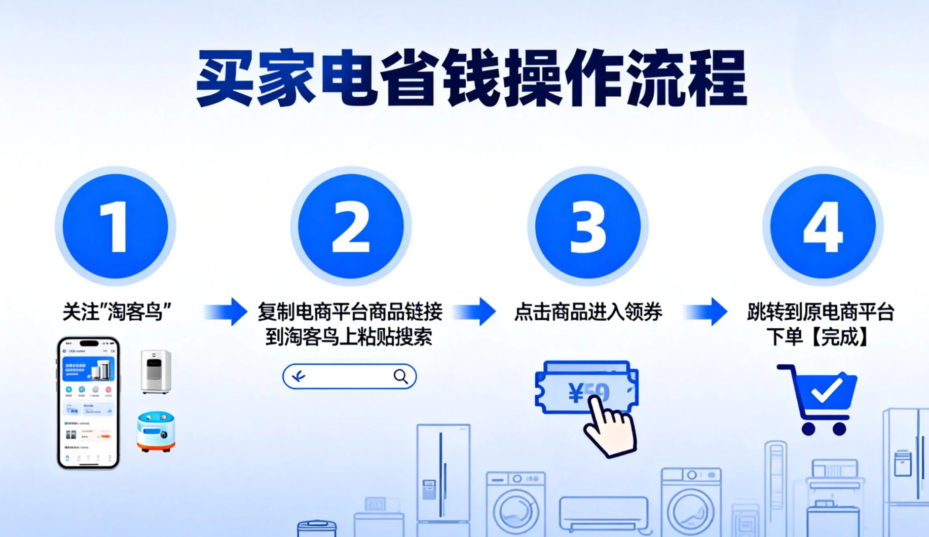 返利公众号是网购省钱的得力助手,其中淘客鸟就备受用户青睐。使用方法非常简单,在淘宝、京东等平台挑选好心仪的家电后,不要直接下单,而是点击商品页右上角的【分享】,选择【复制链接】 ,然后进入 “淘客鸟” 助手,把链接粘贴到对话框发送。这时,系统会自动弹出该商品的隐藏优惠券和返现金额,点击【去下单】,跳转回原平台完成支付。等订单确认收货后,返利就会到账。通过这种方式,购买家电时省下几十上百元并非难事。比如购买一台价值 3000 元的空调,若返利比例为 3%,就能获得 90 元的返利 ,这可是实实在在节省下来的钱。