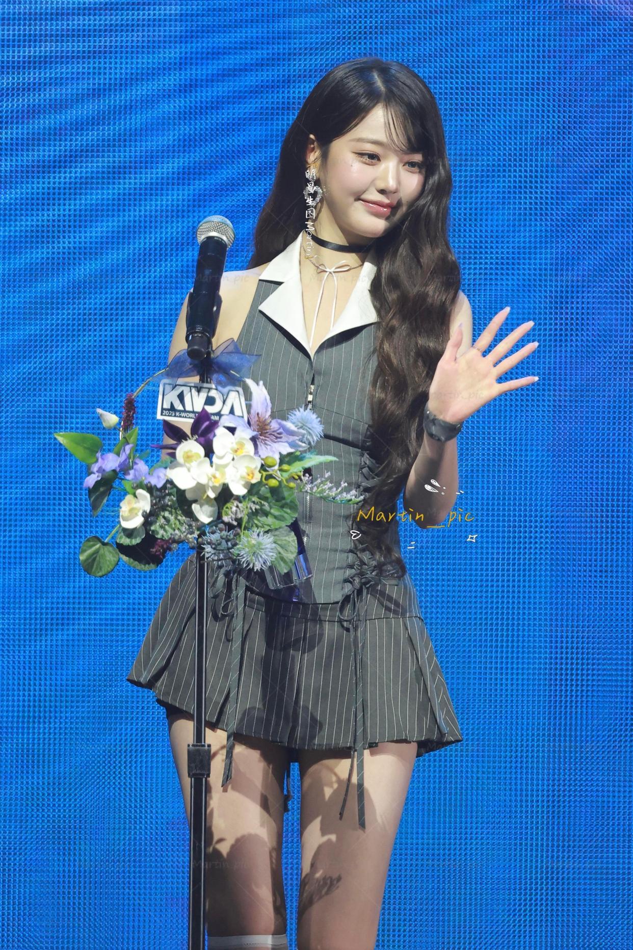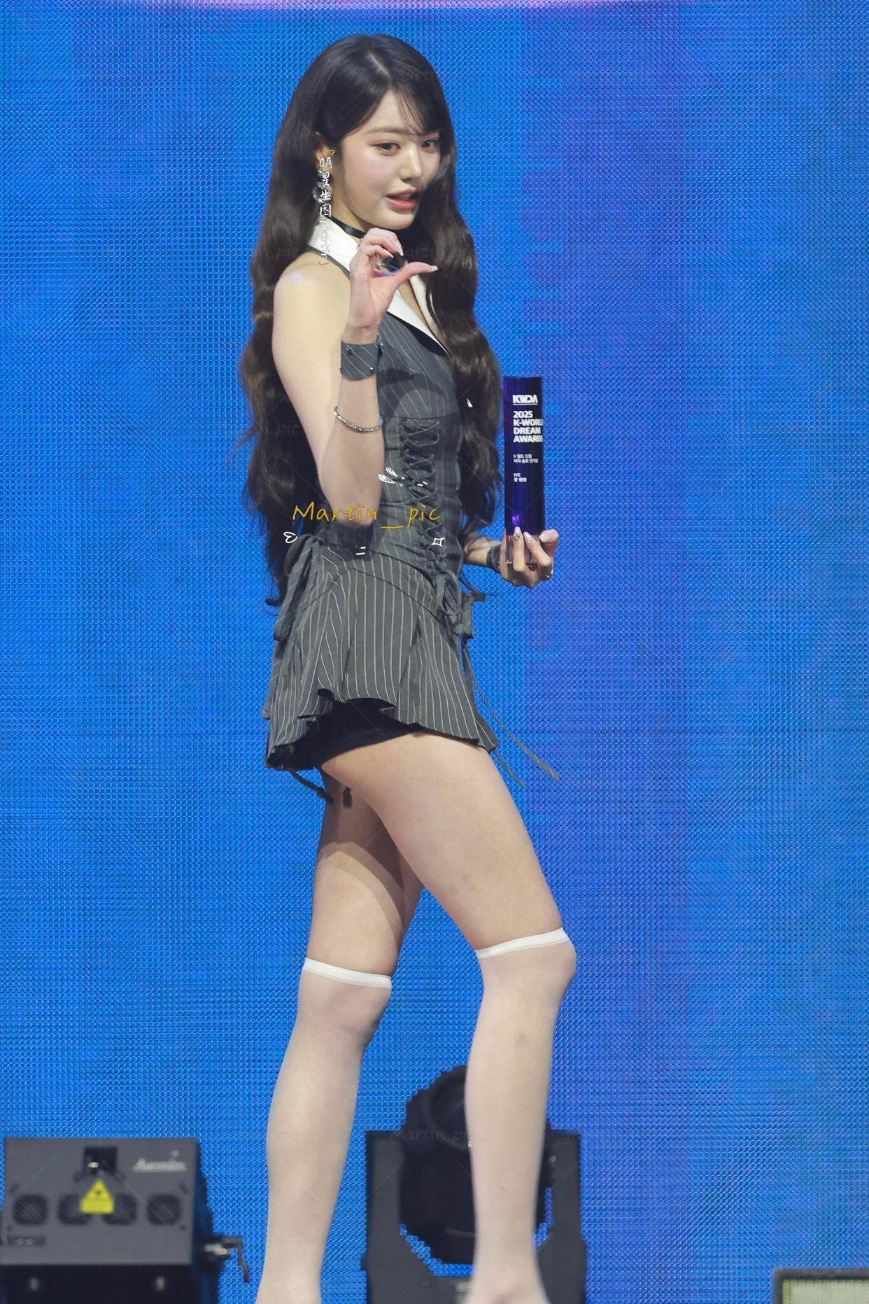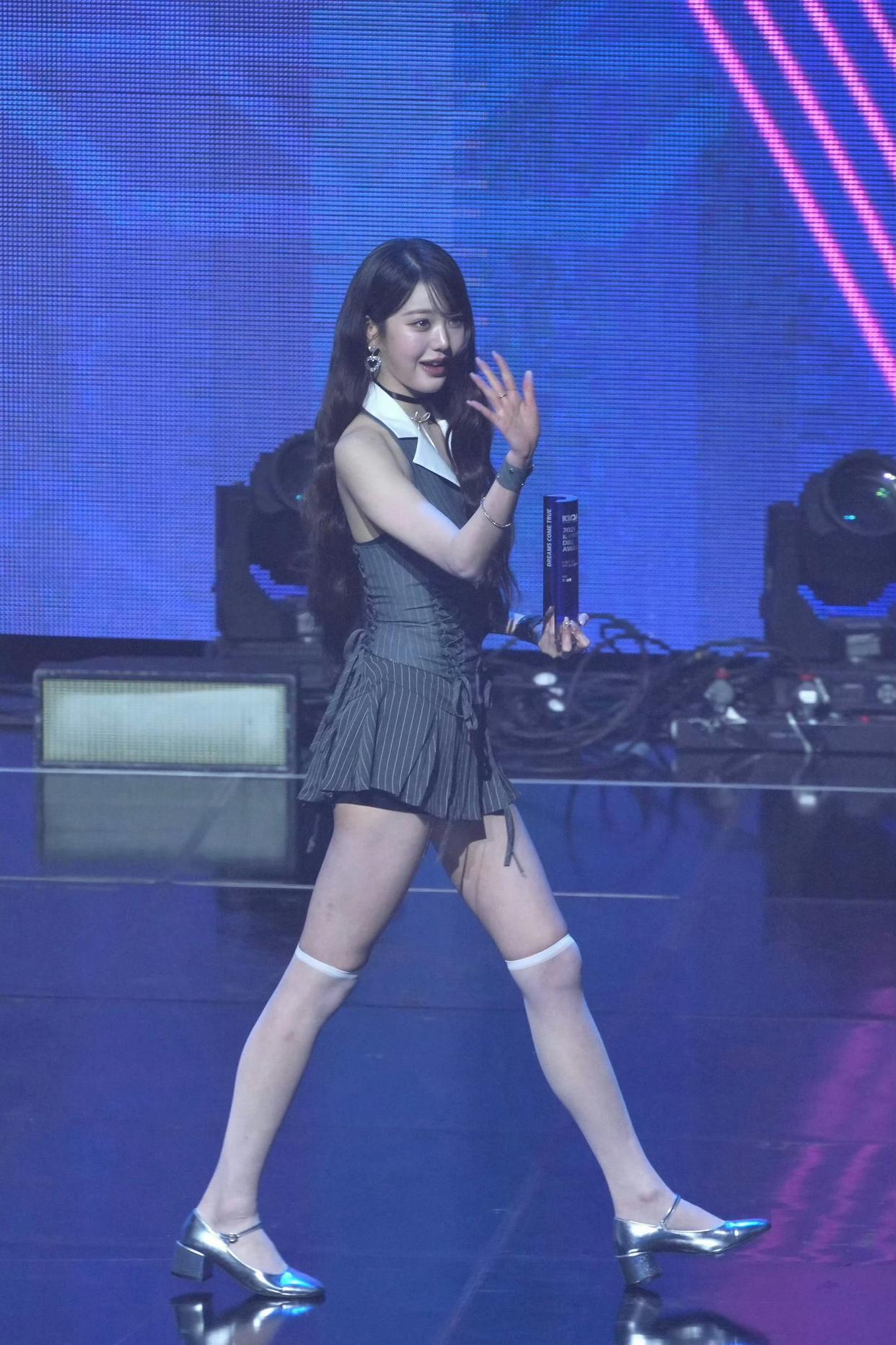 年仅 20 岁的张元英在时尚领域的表现一直可圈可点。这次在 K-WORLD DREAM AWARDS 上的造型,她选择了一条灰黑细条纹短连衣裤,无袖的设计露出她纤细的手臂线条,短款版型则将她的 “超模腿” 完全展现,搭配一双白丝袜,瞬间成为全场焦点,这种风格的混搭让她的穿搭充满了辨识度。