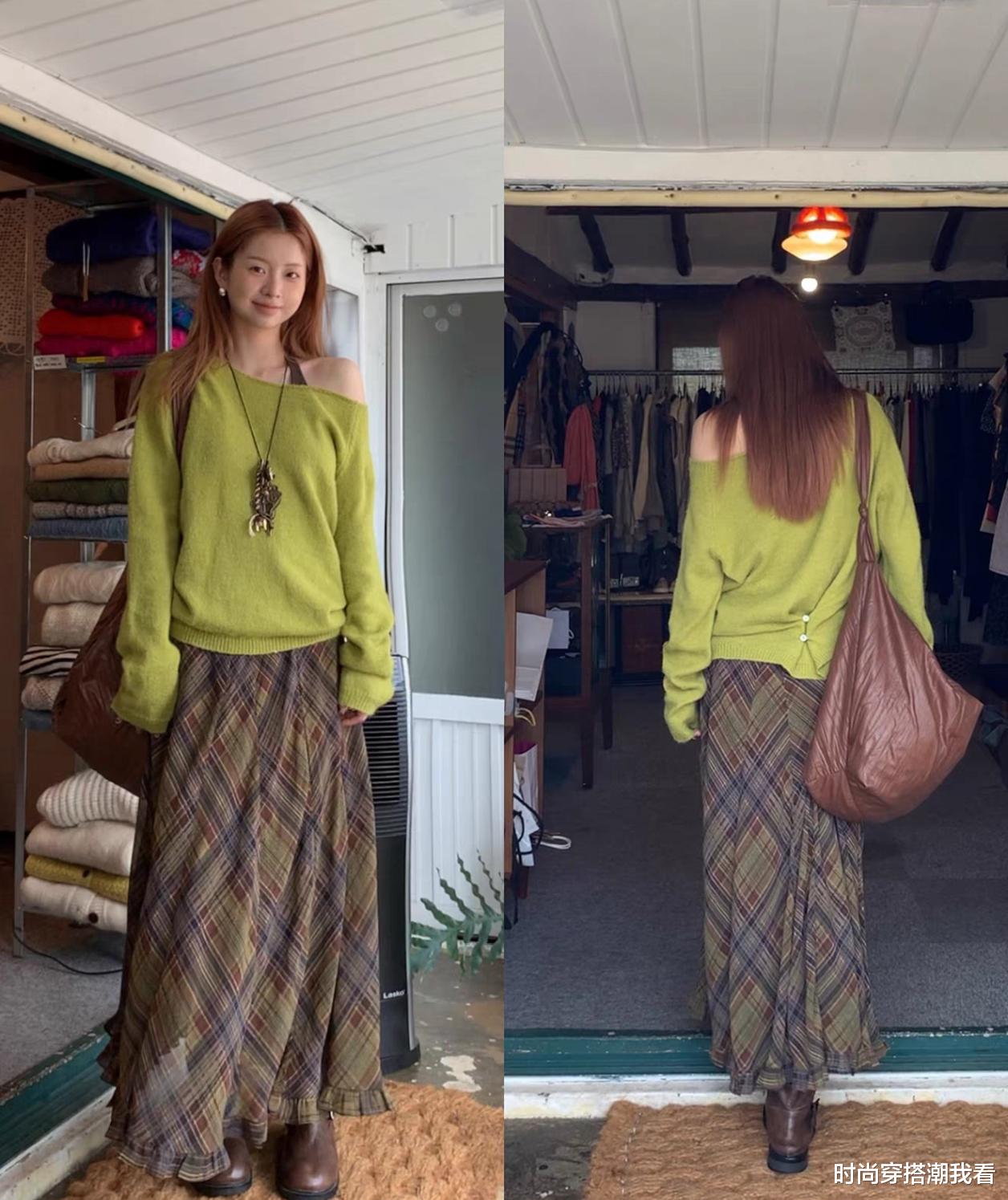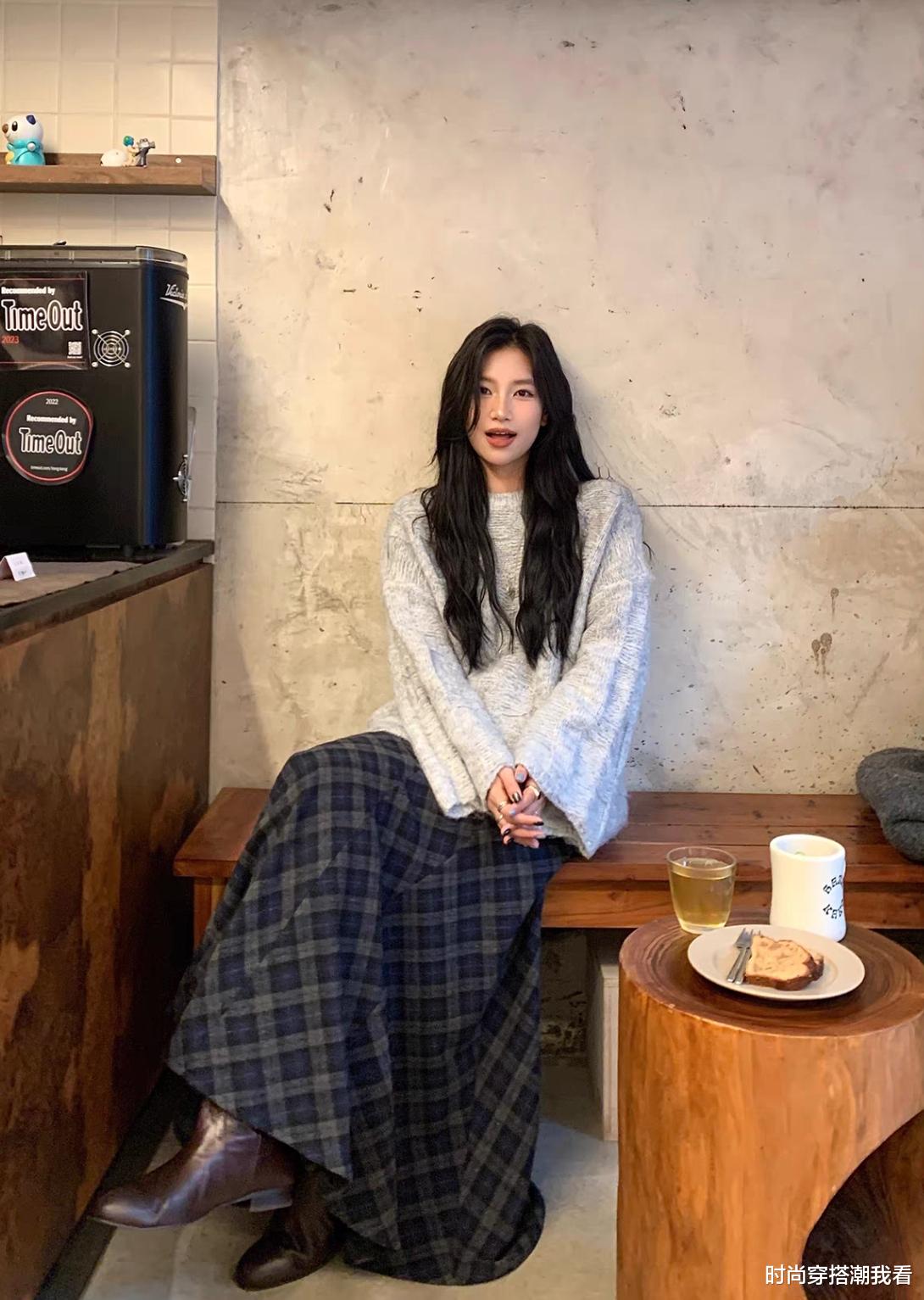 烟灰色的奶奶衫与格子长裙组合,上衣下摆随意塞进裙子里,立刻拉长腿部线条,显得身材比例特别好。