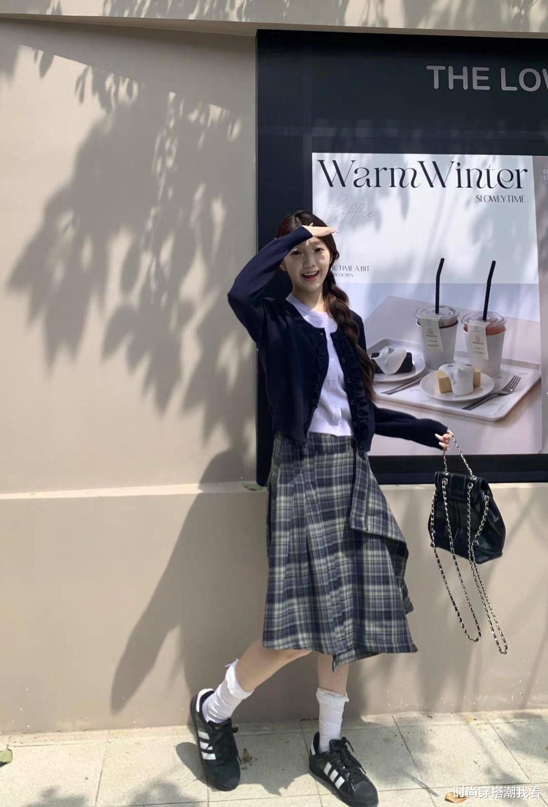 对于学生党或者喜欢年轻风格的人来说,毛衣开衫内搭白色长袖,再配上格子半身裙和小白鞋,满满的学院风扑面而来。