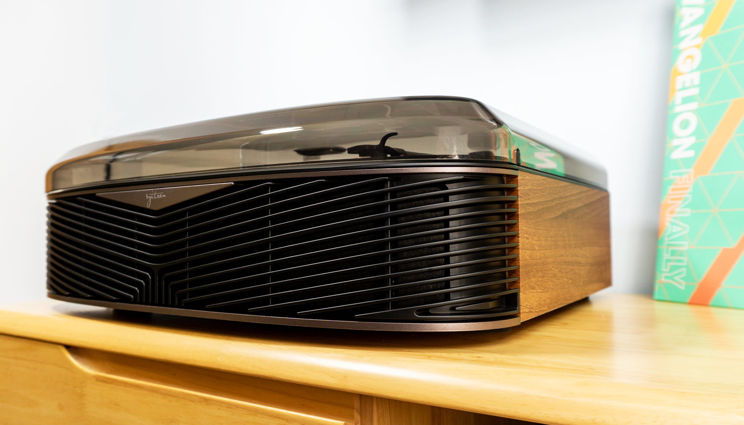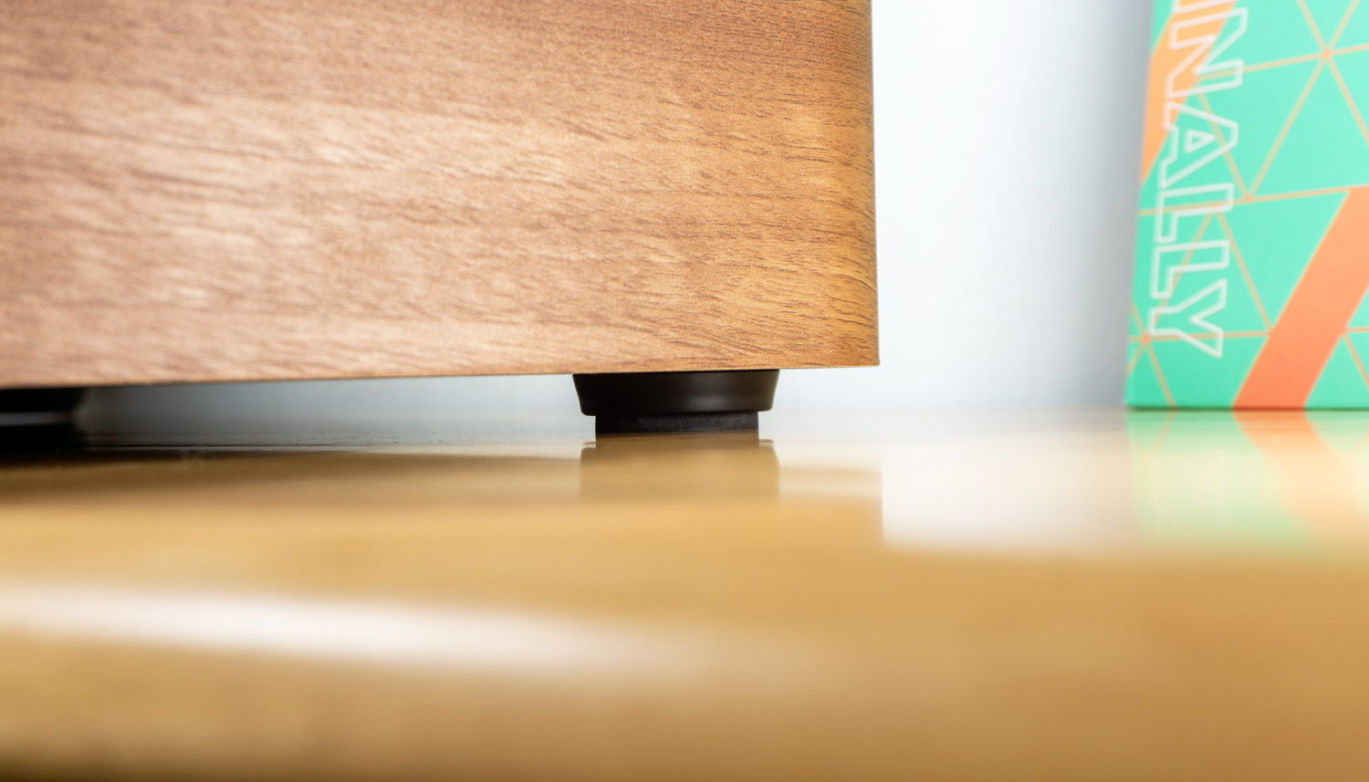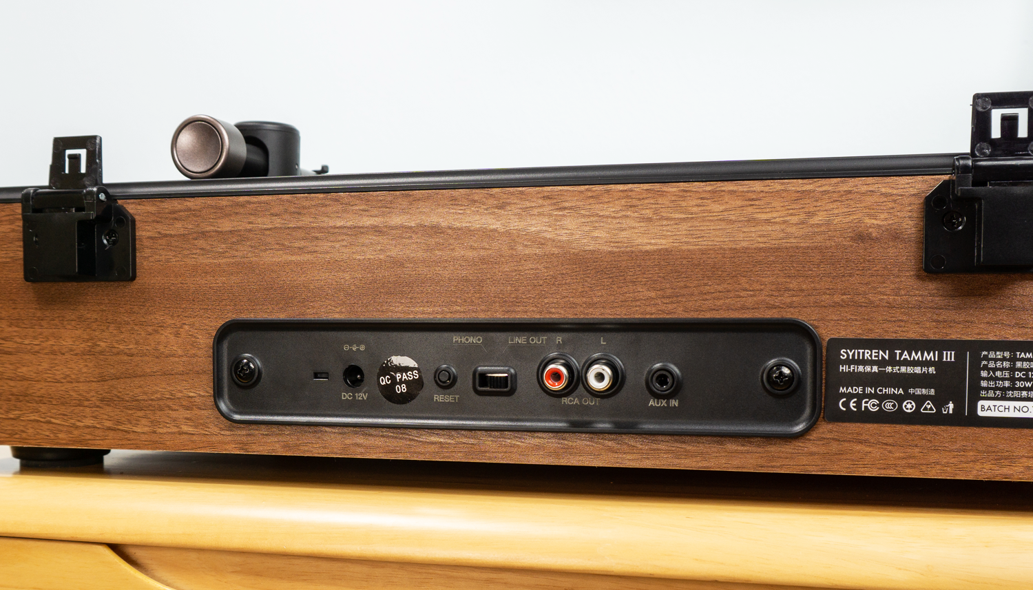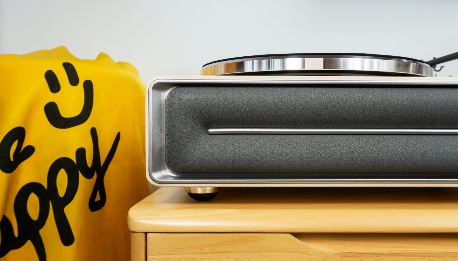 格栅装饰构件之下,藏着一套由两个10W高音单元和两个15W低音单元构成的全频音响系统。有人可能担心一体式唱机的震动会影响唱片稳定,但根据以往我对他家产品的使用经验来说,赛塔林的悬浮式减震技术已经很好地解决了这个问题。