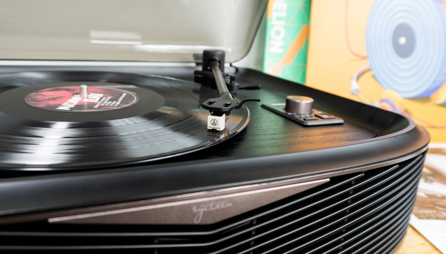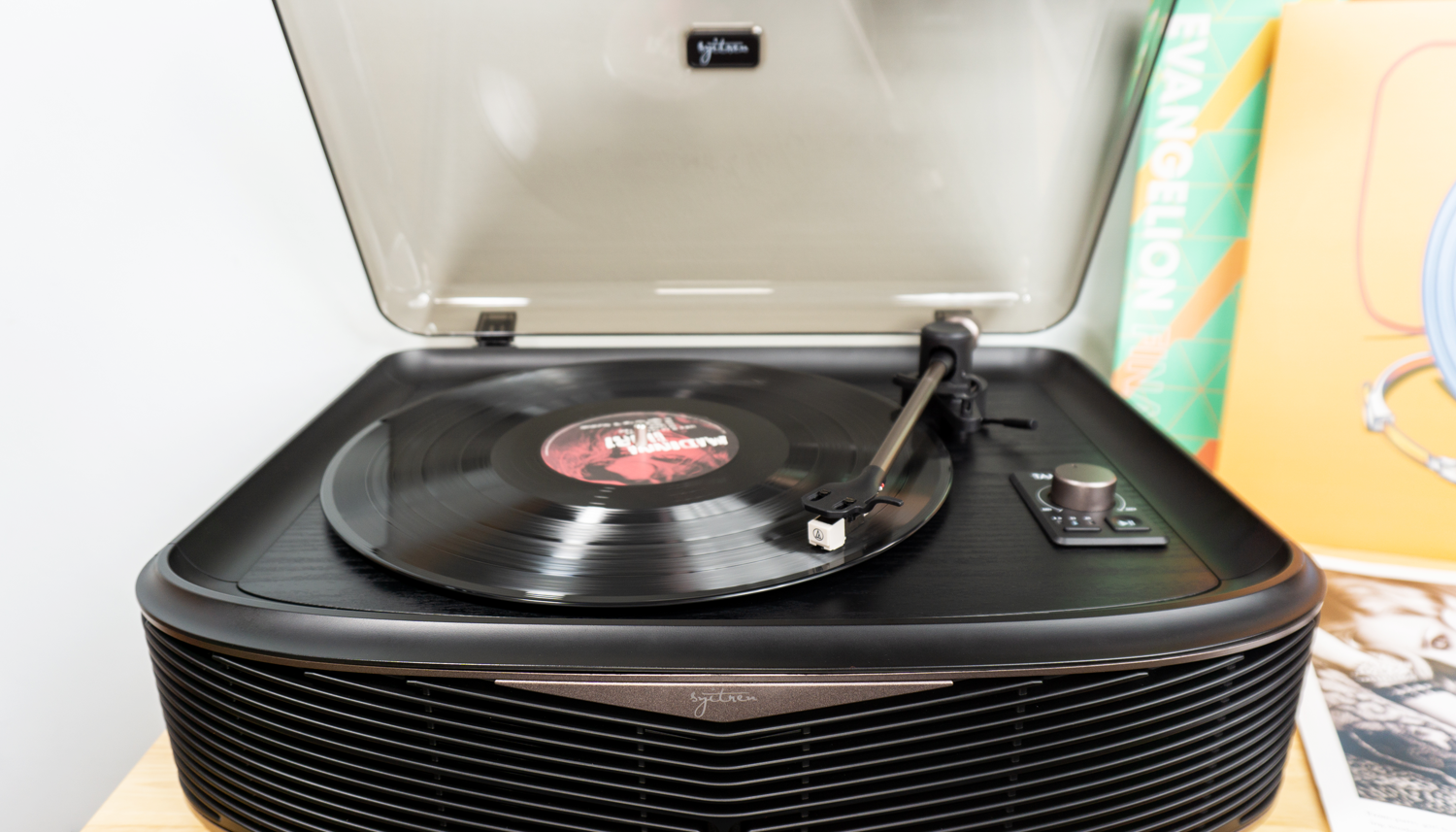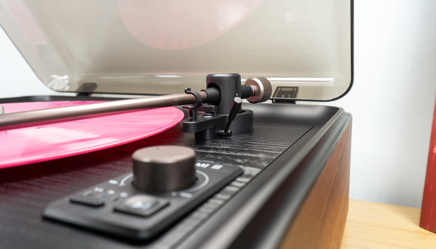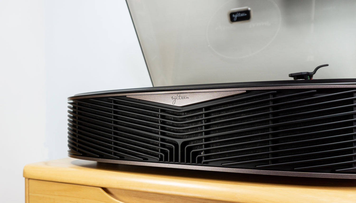 格栅装饰构件之下,藏着一套由两个10W高音单元和两个15W低音单元构成的全频音响系统。有人可能担心一体式唱机的震动会影响唱片稳定,但根据以往我对他家产品的使用经验来说,赛塔林的悬浮式减震技术已经很好地解决了这个问题。